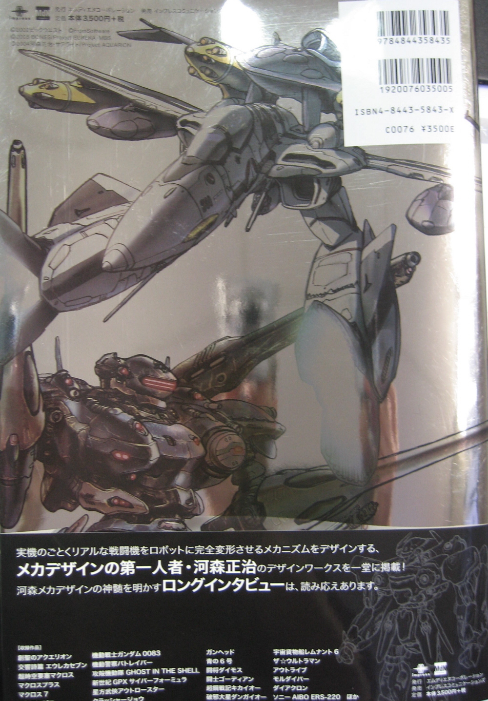 : New book of Shoji Kawamori mecha artwork. Features both color artwork and black & white lineart of mecha from many of the anime series, console games and toys that Kawamori has worked on during his long career. Features artwork of Macross, Cyber Formula, Armored Core, Sony Aibo, Lego Van Force/Exo Force, Patlabor, Gundam Stardust Memory, Crusher Joe, Gunhed, Dangaioh, Outlaw Star, Blue Submarine No.6, GITS, Aquarion & Eureka 7 (see contents page below for full listing). Surprisingly, art from Escaflowne, one of Kawamori's most popular series is absent from this book. The first 15 pages or so of the book feature color design sketches from various series, followed by around 160 pages of black and white lineart. There is then a 24 page interview with Kawamori (in Japanese) at the back of the book, followed by a two page biography. For Macross fans there are 4 color pages at the front of the book as well as 46 pages of black and white lineart. The color pages include a two-page color spread of a cutway YF-19 in fighter mode (previously published in smaller form in the VF-X game books) and two pages of color VF-0 design sketches. The black and white Macross lineart includes both rough design sketches and finished design drawings from SDF-Macross, DYRL, Macross Plus, Macross 7, VF-X2, M3 & Macross Zero. The long-awaited Macross Zero lineart occupies 17 pages out of the above-mentioned 46 pages. The Macross Zero lineart also includes the first ever published drawing of the SV-51's landing gear. Most of the non-Macross Zero lineart has previosly been published in other Macross artbooks. Also included are 4 pages of thumbnail pics of just about every Battroid and Fighter from the Macross universe. These thumbnail pics are nice touch in my opinion If you are a fan of Kawamori's mecha designs, this book is a must have. If however you are only a Macross fan and already own other Macross art books, the high price of this book may make you think twice. However, in my opinion, it is worth it just for the rare Macross Zero lineart and the beautiful VF-0S with Ghost Booster art on the rear cover. Graham |