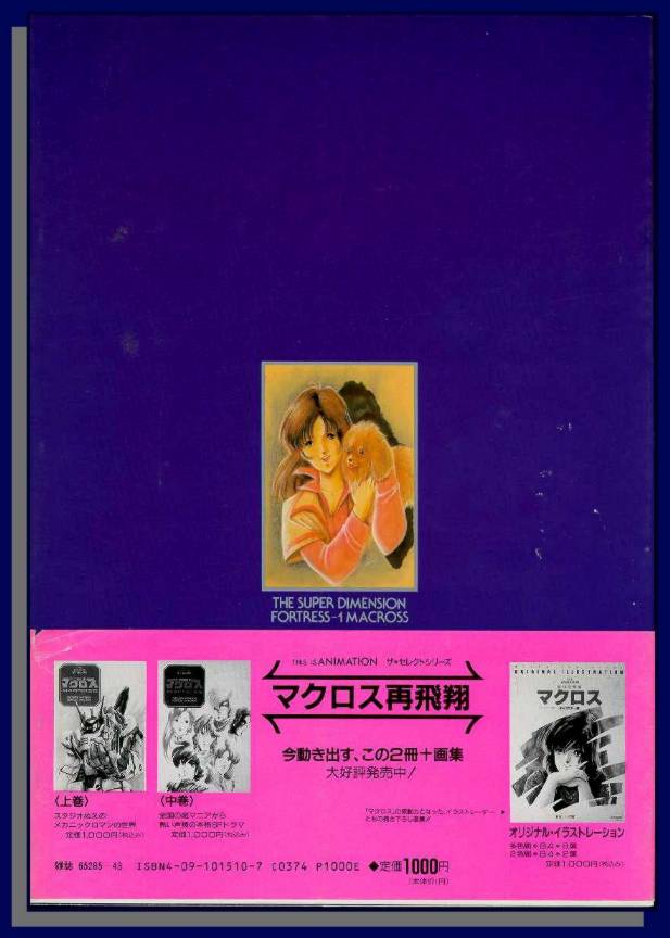 Volume #3 : Summarized pictorial account of episodes 1-7. Character, Mecha, Background, and Storyboard designs. Staff and Voice actor interviews. Macross Umbrella, vinyl/metal toys, sketch book merchandise pictures in back. Pull out 2 sided poster-Minmay on front / Macross on back. Volume #5 : Summarized pictorial account of episodes 8-18. Character, Mecha, Background, and Storyboard designs. Staff and Voice actor interviews. Imai and Arii Macross model pictures in back. Pull out 2 sided poster-Minmay on front / Macross opening animation on back. Volume #7 : Summarized pictorial account of episodes 19-36. Character, Mecha, Background, and Storyboard designs. Staff and Voice actor interviews. Pull out 2 sided poster-Misa on front / Macross on back. |