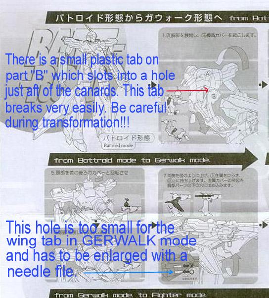 3) The lower slots in the left and right sides of the torso that the wings lock into in GERWALK mode will probably be too small to accept the wing tabs (see ABOVE picture for further details). If you try to force the wing tabs into the slots you will just end up rubbing paint off the die-cast wing tabs. Carefully file these slots with a flat needle file until they are large enough to accept the wing tabs. The slots are in a plastic part of the chest so they are easy to file. Be careful to file just enough so that the wing tabs fit firmly. Do not over-file as you do not want a loose fit!