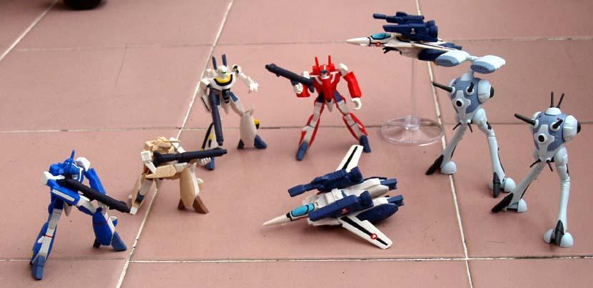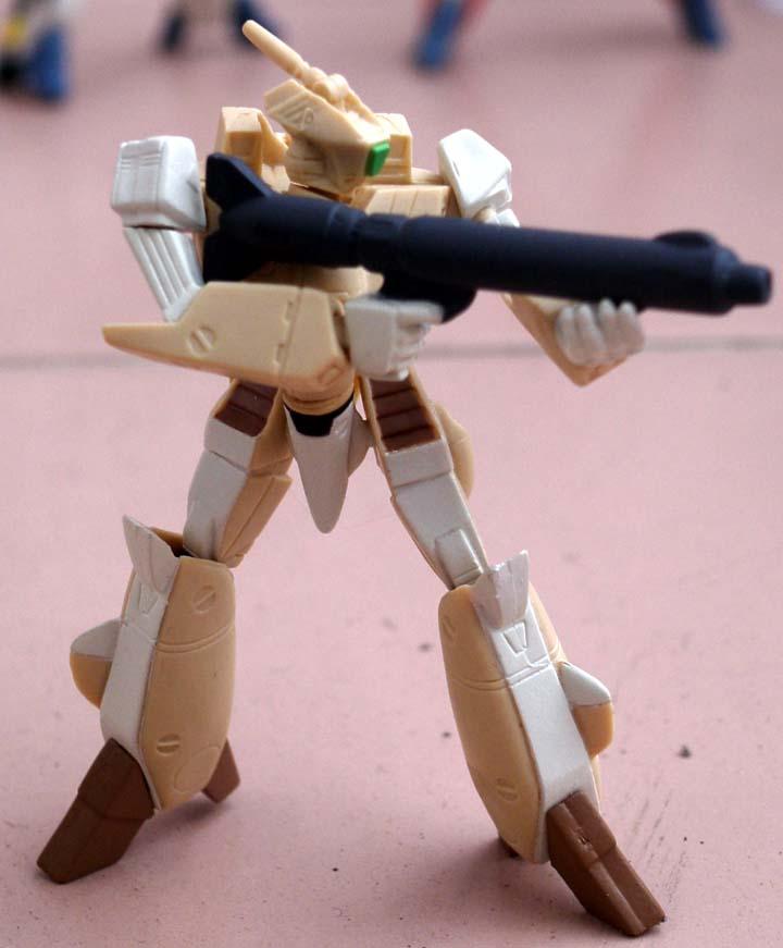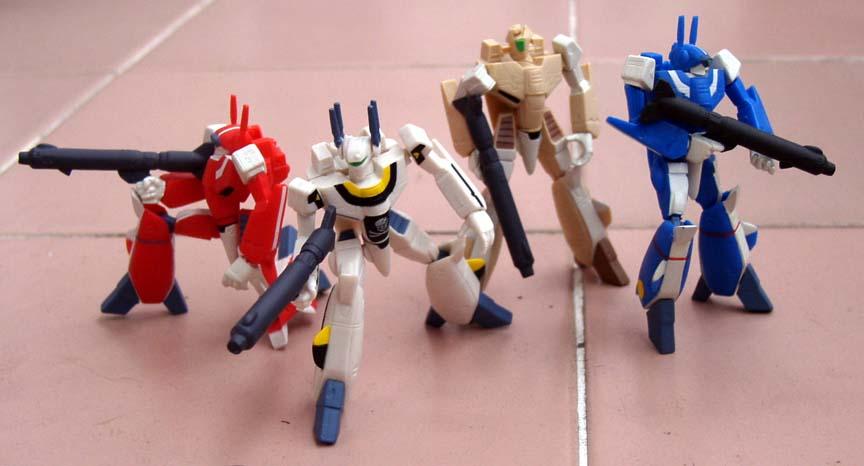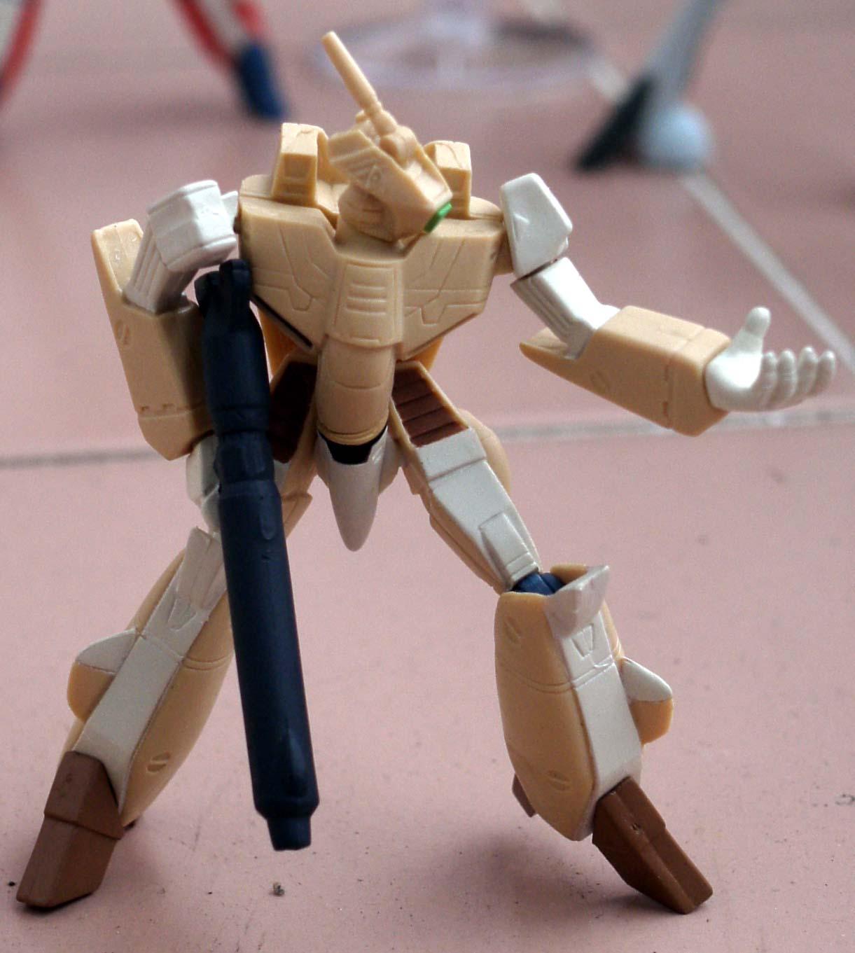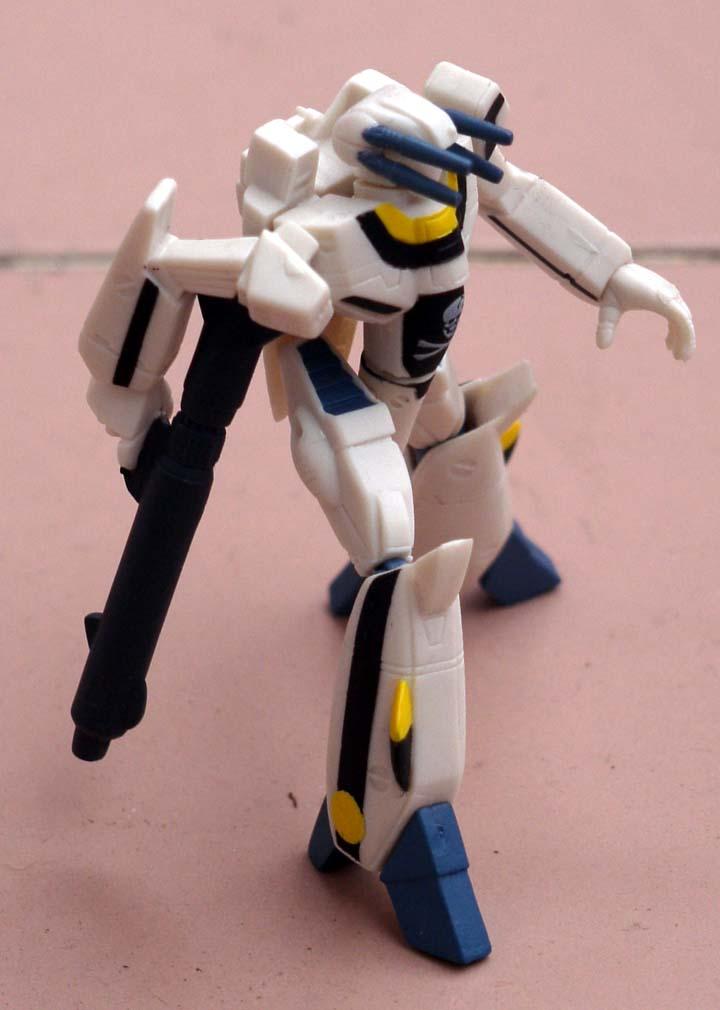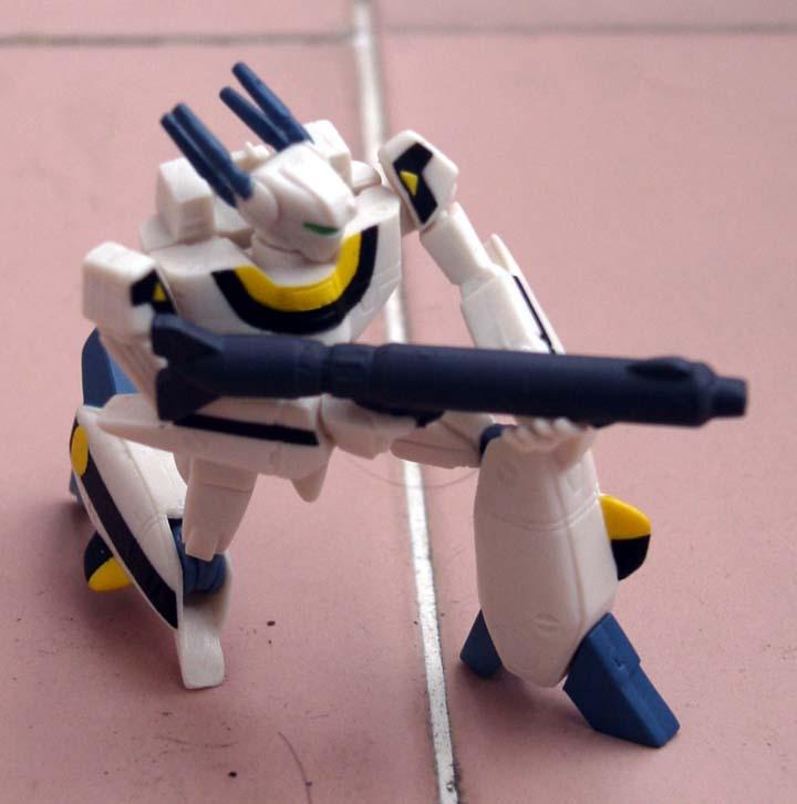 The VF-1S's head lasers are also rotatable and the VF-1A's head laser can be unplugged and positioned to point either forward or backwards.The head lasers on the two VF-1J figures are fixed. About the only critiscm that I could find of the battroids is that there is no articulation of the elbows and the gunpod cannot be removed from the right hand.