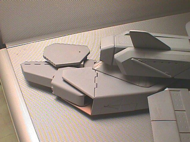 Though the parts fit still looks a tad rickety, it's simply that I'm not able to use any glue on the patterns for fear of damaging them. The finished model will sport tiny hardpoints that the modeler may drill-out and fit with metal pins for extra support; thus providing for an exceptionally-sturdy model, regardless of the mode.