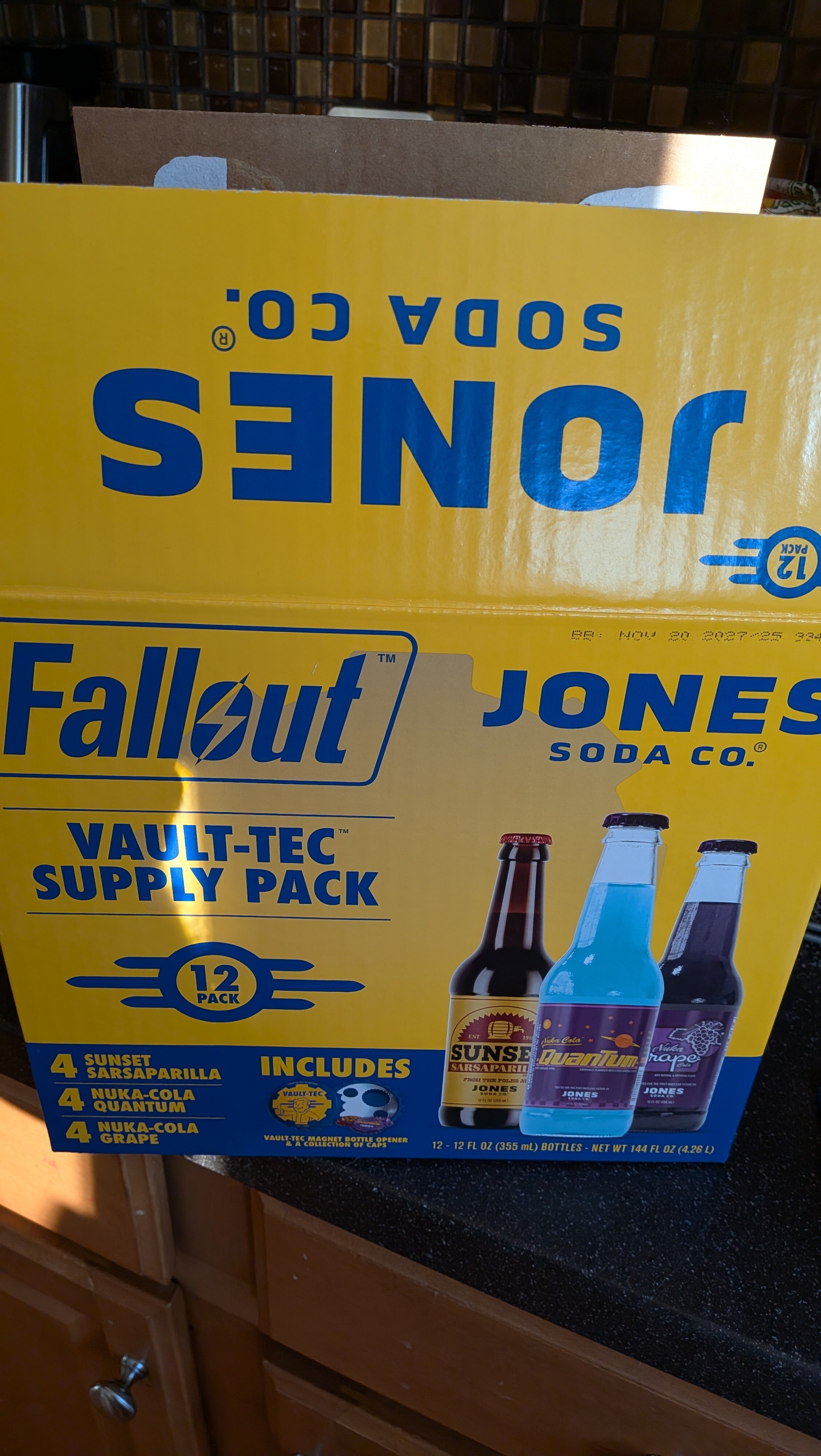 Found the FALLOUT Vault-Tec Supply Pack by Jones soda at my local Costco. $20 for 12 bottles, eh. So I bought one case and its typical Jones soda. Good but super sweet, lol. It's a whimsical treat as we typically only drink kombucha with lunch or dinner. https://www.jonessoda.com/pages/costco-ne-fallout?srsltid=AfmBOopZ2HZJY5VvACzoKc9gzRTmzD_VHwpOFLs5NO6oNNeUWkRhH8ry