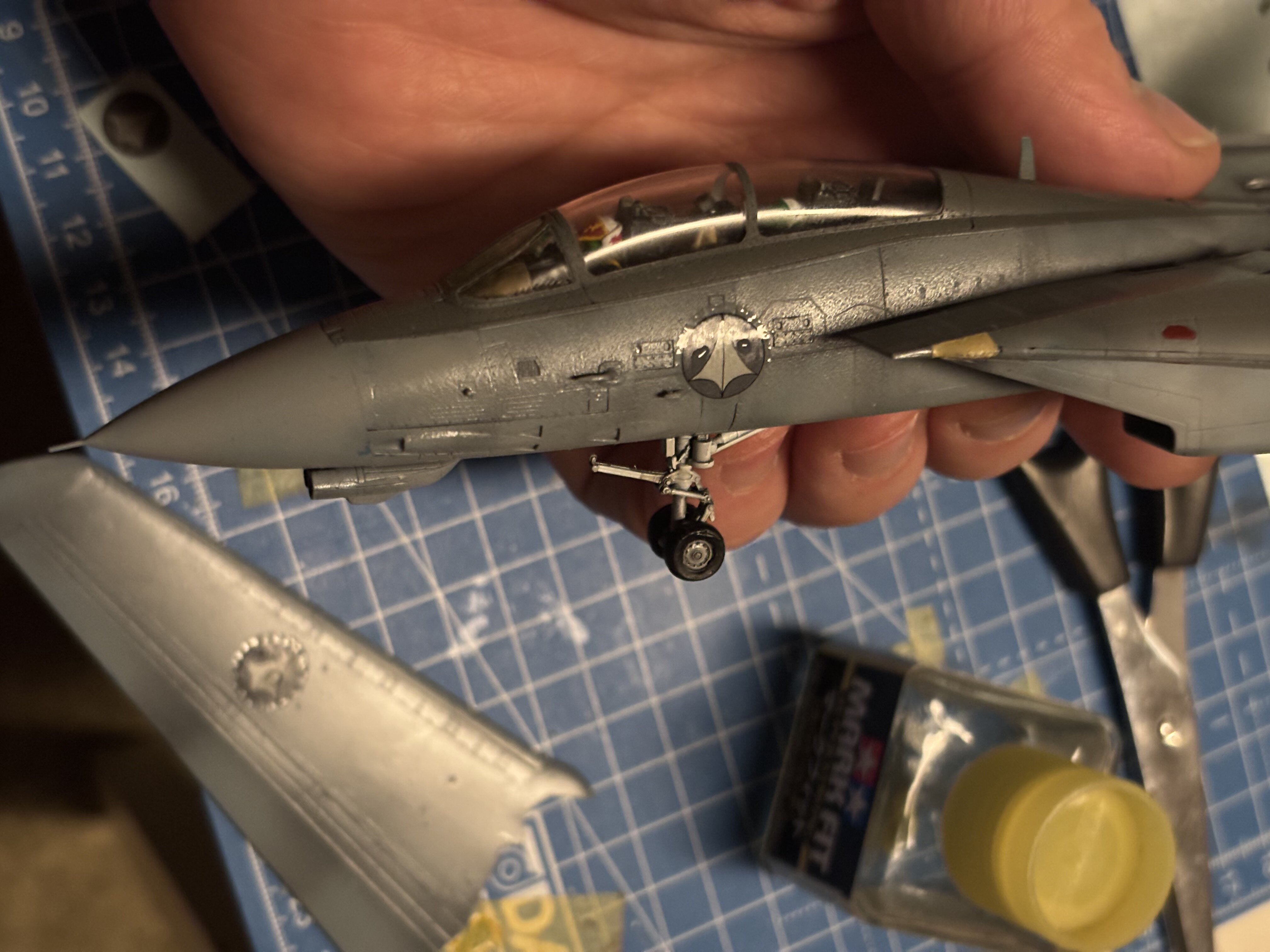 Nice stuff @tekering decal time. For the Macross F-14 I got „cheap“ Chinese decal reprints. Cheap not because they where cheap, but because of the print quality. I am only going to use the macross related decals, the rest will be done by GWH decals. I drenched those decals in mark setter strong over and over again. It really took a lot of time for them to properly sink into the panel lines. Really sturdy and thick transfer foil. I might wanna go the sand down approach… but… maybe not. then while apply the decals on the vertical stabiliser, I notice I forgot to airbrush the black stuff behind the wings on the fuselage. Will do that tomorrow. The decals ate too much of my concentration.