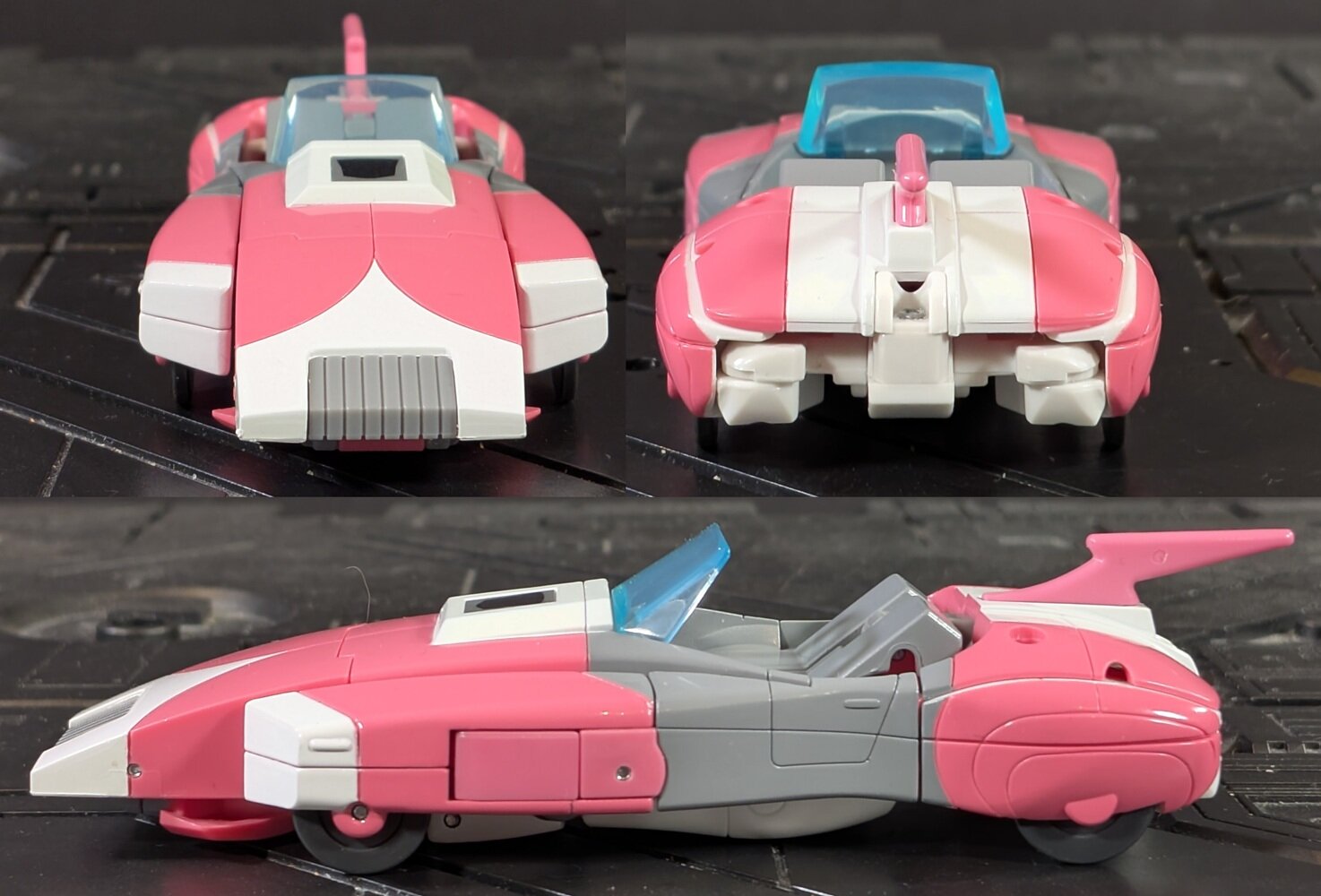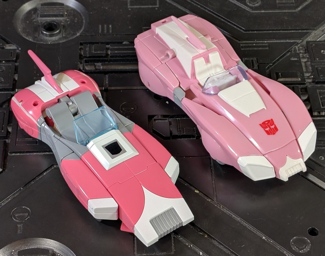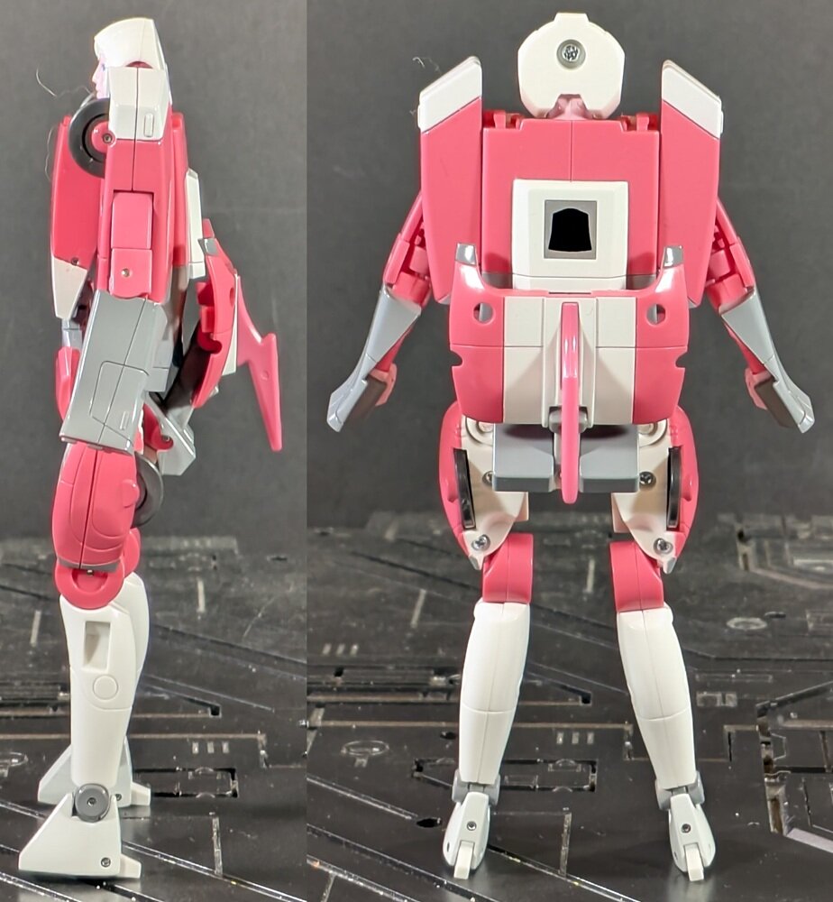 Missing Link Optimus (and, to a lesser extent, Bumblebee) were interesting to me because it took a figure I (and I expect most Transformers fans) was incredibly familiar with, but gave it a more modern level of articulation and made a few improvements to eliminate the partsforming elements of the original. Missing Link Sunstreaker was interesting to me because I wasn't familiar with the original. Although the Missing Link version featured articulation and integrated hands that the original never did, it was my first time experiencing even the basic transformation engineering. The newest entry in the Missing Link line is interesting to me for third, brand new reason—because there never was a G1 toy. Yeah, we're talking about Missing Link Arcee. Note that she's based on an unreleased prototype, though there's a Missing Link version of said prototype. This made for a tough call on my part... the prototype version, with its different head sculpt and mix of orange and purple colors, could be argued as being more toy accurate. Except that it literally only existed as a hand-sculpted, non-transforming prototype. I'm not even sure if the images that were making the rounds were even of the physical prototype. Frankly, it's not certain that the toy would have actually been orange had it gotten further along in production, and I ultimately went with more traditional Arcee colors (though I wish they'd have kept the prototype head sculpt). Regardless of color, Missing Link Arcee gives a reasonable depiction of what a G1 Arcee toy might have looked like, with awkward shoulders, a flat chest, wide hips, and knock knees, though she still seems a bit more modern than the likes of G1 Kup, Blurr, or Hot Rod. Heck, her car kibble even cleans up quite a bit tighter than the SS86 toy! There seems to be a big departure here compared to the other Missing Link figures released so far. See, while Prime and Sunstreaker did come with stickers, if you wanted that look, their sticker details were actually sculpted and painted onto the toys already. Arcee, on the other hand, is looking pretty plain here. She doesn't even have an Autobot badge on her chest. But there are stickers that provide that badge, as well as covers for the screws on her shoulders and colorful bits for her toes and belly button. Her sole accessory is this pink gun. Although not a match for the gun she uses in the '86 movie (which the SS86 toy's gun is based on), I do believe that it's based on a gun she briefly used in the third season. If you want the movie-style pistol, well, I hear it comes with the prototype-colored version. Takara really wants you to double dip on this mold. Articulation isn't quite up to modern standards, but far beyond most of the actual '86 toys. Her head can swivel, and she can look about 45 degrees upward. Her shoulders, including the car fenders, can swivel, while a hinge gives her maybe 60 degrees of lateral movement. Her biceps swivel, and her elbows can bend just over 90 degrees. No waist or wrist swivels. Her hips can go about 90 degrees backward and nearly 180 degrees forward, though you have to move them out enough to clear per pelvis. Speaking of, they move 90 degrees laterally. She has a restricted thigh swivel; you can turn her legs about 45 degrees outward and just a touch inward. Her knees bend about 120 degrees. Her feet can tilt up and down about 45 degrees, and her ankles pivot about 45 degrees. Arcee can hold her gun in either hand. There are also peg holes on her backpack you can plug the gun into. The transformation is, honestly, kind of similar to the SS86 toy. Hinges move her hips to the rear of the vehicle, and her legs swing up so they can tuck under it. The front of her torso flips up to form the nose of the car, while the hood scoop, seats, and rear section with the fin are all parts of her backpack. The big difference is that SS86 Arcee has a lot more backpack to unfold, using it to make up more of the car's exterior while hiding her limbs. Meanwhile, Missing Link Arcee uses the arms to make the fenders and sides of the car, with her actual thighs making parts of the rear. And, y'know, maybe G1 toys didn't always have the best robot modes. But the vehicle modes were still pretty good, and that's definitely the case here. Not exactly cartoon-accurate, as she's significantly narrower with a longer nose that goes way past her front fenders versus the cartoon, yet it does so in a way that captures the sporty, almost hourglass shape the car had with wider fenders and a narrower cockpit, a short, round butt, and a long, sloping nose in a way that Titans Return, Kingdom, and even MMC's third party version didn't quite get. My only real gripe is the corners of her pelvis sticking out a bit from under the nose. Weapon storage on G1 toys wasn't aways a give, but there are two holes near the fin on the back of Arcee's car mode. Either of them can be used to store her gun while she's in alt mode (they're the same spots you can use the store them on her backpack). Growing up poor, I had more Gobots than actual Transformers prior to the '86 movie, but in the Christmas of 1986 I got the entire movie cast save for Cyclonus, Scourge, Gnaw, and Springer. I've rectified that as an adult, and even posted here comparing the '86 toys to some modern Siege, Kingdom, and Studio Series counterparts (something I could update, what with newer SS86 versions of Magnus, Springer and Galvatron). Despite being an important part of the new-for-the-movie cast, and despite having her SS86 figure hanging with her modern movie counterparts, Arcee is not among my 1986 G1 toys. While not truly a 1986 toy, or even a reimagining of an '86 toy with additional articulation, Missing Link Arcee is a sort of "what if?" that can represent the character with my actual 1986 toys. I think that's all I really needed her to be, but the fact that she's kind of decent even by modern standards, with a lot less kibble on her than most Arcee toys, ma