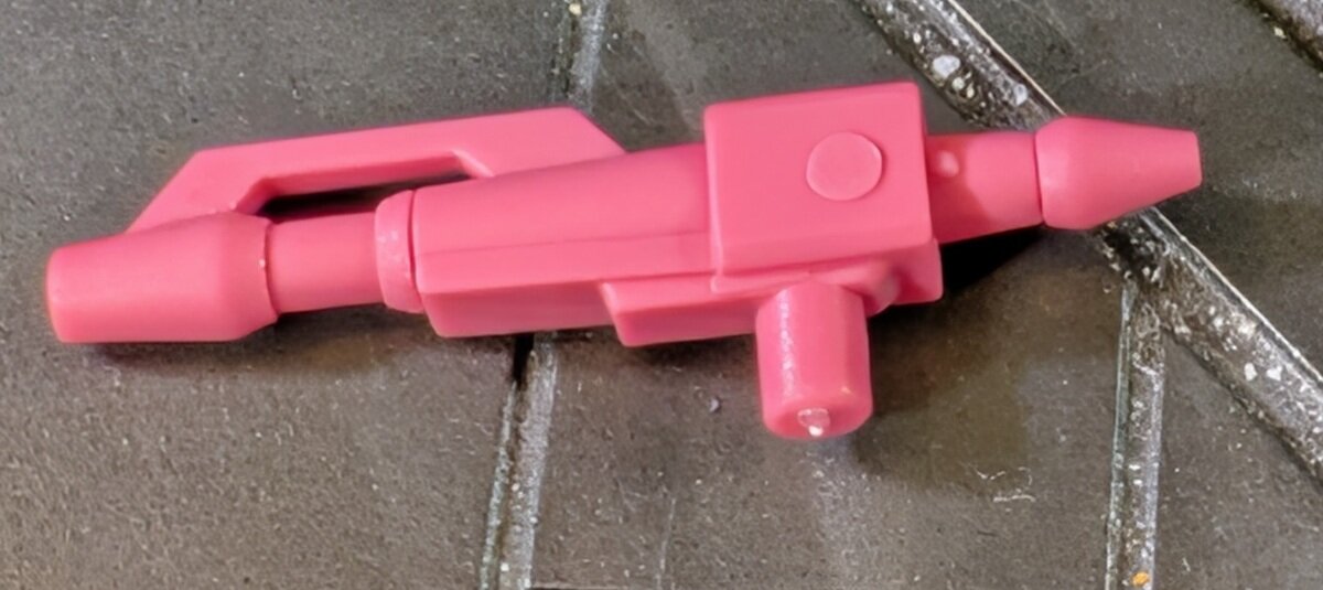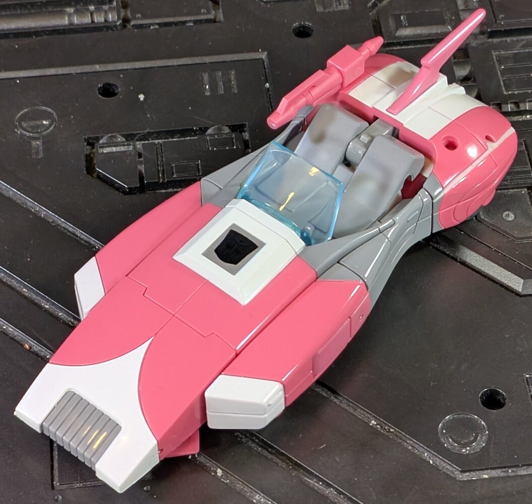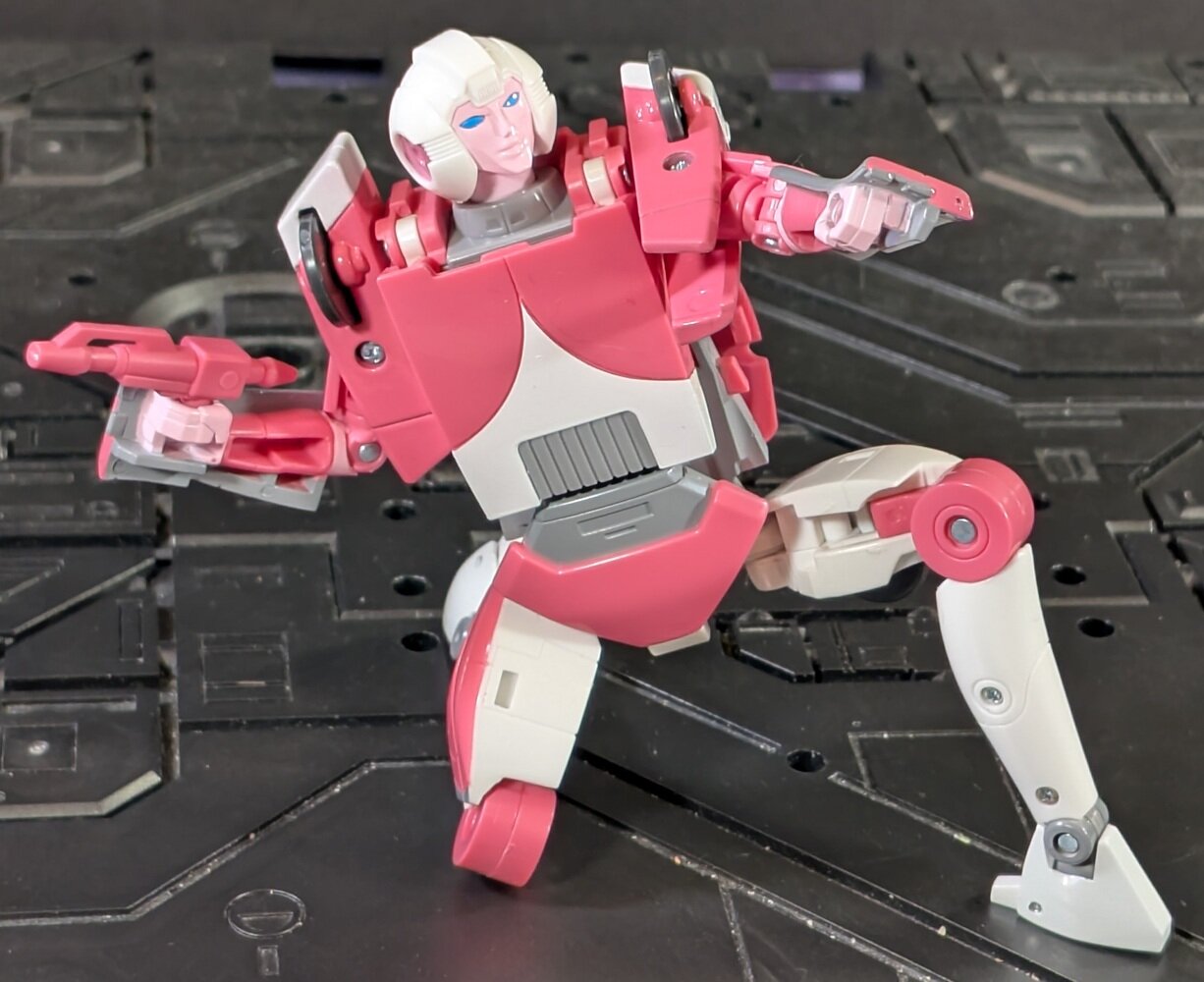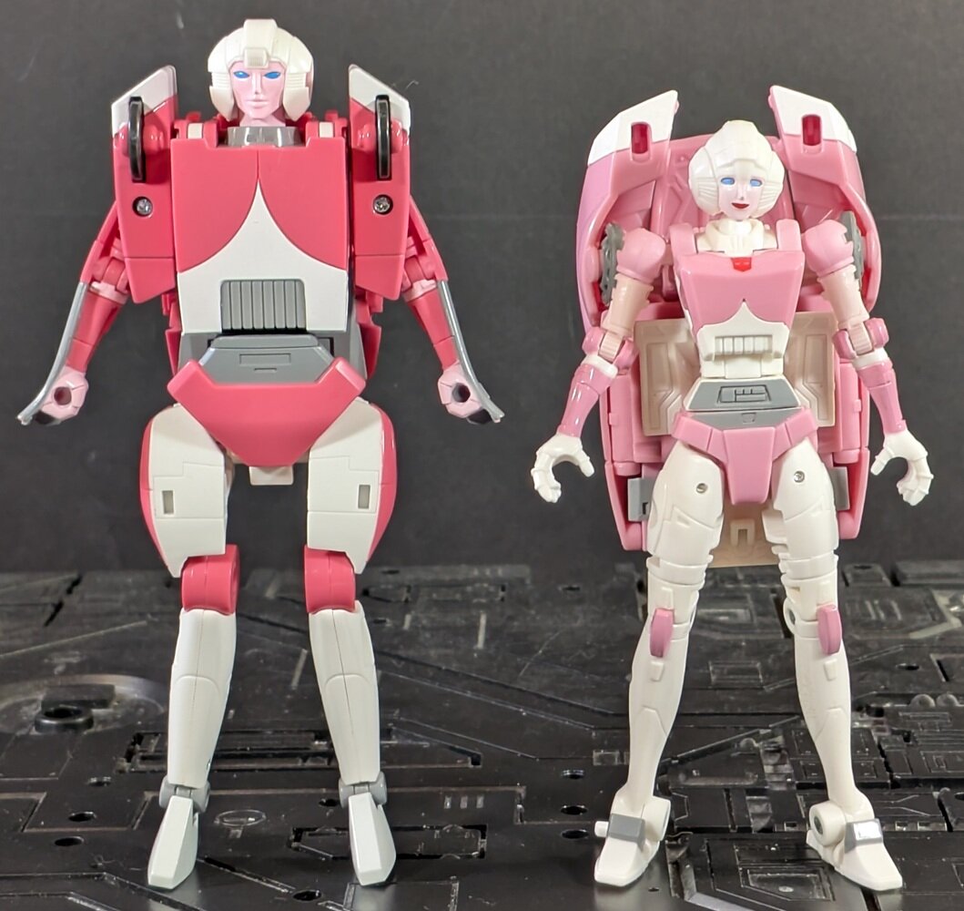 Missing Link Optimus (and, to a lesser extent, Bumblebee) were interesting to me because it took a figure I (and I expect most Transformers fans) was incredibly familiar with, but gave it a more modern level of articulation and made a few improvements to eliminate the partsforming elements of the original. Missing Link Sunstreaker was interesting to me because I wasn't familiar with the original. Although the Missing Link version featured articulation and integrated hands that the original never did, it was my first time experiencing even the basic transformation engineering. The newest entry in the Missing Link line is interesting to me for third, brand new reason—because there never was a G1 toy. Yeah, we're talking about Missing Link Arcee. Note that she's based on an unreleased prototype, though there's a Missing Link version of said prototype. This made for a tough call on my part... the prototype version, with its different head sculpt and mix of orange and purple colors, could be argued as being more toy accurate. Except that it literally only existed as a hand-sculpted, non-transforming prototype. I'm not even sure if the images that were making the rounds were even of the physical prototype. Frankly, it's not certain that the toy would have actually been orange had it gotten further along in production, and I ultimately went with more traditional Arcee colors (though I wish they'd have kept the prototype head sculpt). Regardless of color, Missing Link Arcee gives a reasonable depiction of what a G1 Arcee toy might have looked like, with awkward shoulders, a flat chest, wide hips, and knock knees, though she still seems a bit more modern than the likes of G1 Kup, Blurr, or Hot Rod. Heck, her car kibble even cleans up quite a bit tighter than the SS86 toy! There seems to be a big departure here compared to the other Missing Link figures released so far. See, while Prime and Sunstreaker did come with stickers, if you wanted that look, their sticker details were actually sculpted and painted onto the toys already. Arcee, on the other hand, is looking pretty plain here. She doesn't even have an Autobot badge on her chest. But there are stickers that provide that badge, as well as covers for the screws on her shoulders and colorful bits for her toes and belly button. Her sole accessory is this pink gun. Although not a match for the gun she uses in the '86 movie (which the SS86 toy's gun is based on), I do believe that it's based on a gun she briefly used in the third season. If you want the movie-style pistol, well, I hear it comes with the prototype-colored version. Takara really wants you to double dip on this mold. Articulation isn't quite up to modern standards, but far beyond most of the actual '86 toys. Her head can swivel, and she can look about 45 degrees upward. Her shoulders, including the car fenders, can swivel, while a hinge gives her maybe 60 degrees of lateral movement. Her biceps swivel, and her elbows can bend just over 90 degrees. No waist or wrist swivels. Her hips can go about 90 degrees backward and nearly 180 degrees forward, though you have to move them out enough to clear per pelvis. Speaking of, they move 90 degrees laterally. She has a restricted thigh swivel; you can turn her legs about 45 degrees outward and just a touch inward. Her knees bend about 120 degrees. Her feet can tilt up and down about 45 degrees, and her ankles pivot about 45 degrees. Arcee can hold her gun in either hand. There are also peg holes on her backpack you can plug the gun into. The transformation is, honestly, kind of similar to the SS86 toy. Hinges move her hips to the rear of the vehicle, and her legs swing up so they can tuck under it. The front of her torso flips up to form the nose of the car, while the hood scoop, seats, and rear section with the fin are all parts of her backpack. The big difference is that SS86 Arcee has a lot more backpack to unfold, using it to make up more of the car's exterior while hiding her limbs. Meanwhile, Missing Link Arcee uses the arms to make the fenders and sides of the car, with her actual thighs making parts of the rear. And, y'know, maybe G1 toys didn't always have the best robot modes. But the vehicle modes were still pretty good, and that's definitely the case here. Not exactly cartoon-accurate, as she's significantly narrower with a longer nose that goes way past her front fenders versus the cartoon, yet it does so in a way that captures the sporty, almost hourglass shape the car had with wider fenders and a narrower cockpit, a short, round butt, and a long, sloping nose in a way that Titans Return, Kingdom, and even MMC's third party version didn't quite get. My only real gripe is the corners of her pelvis sticking out a bit from under the nose. Weapon storage on G1 toys wasn't aways a give, but there are two holes near the fin on the back of Arcee's car mode. Either of them can be used to store her gun while she's in alt mode (they're the same spots you can use the store them on her backpack). Growing up poor, I had more Gobots than actual Transformers prior to the '86 movie, but in the Christmas of 1986 I got the entire movie cast save for Cyclonus, Scourge, Gnaw, and Springer. I've rectified that as an adult, and even posted here comparing the '86 toys to some modern Siege, Kingdom, and Studio Series counterparts (something I could update, what with newer SS86 versions of Magnus, Springer and Galvatron). Despite being an important part of the new-for-the-movie cast, and despite having her SS86 figure hanging with her modern movie counterparts, Arcee is not among my 1986 G1 toys. While not truly a 1986 toy, or even a reimagining of an '86 toy with additional articulation, Missing Link Arcee is a sort of "what if?" that can represent the character with my actual 1986 toys. I think that's all I really needed her to be, but the fact that she's kind of decent even by modern standards, with a lot less kibble on her than most Arcee toys, ma