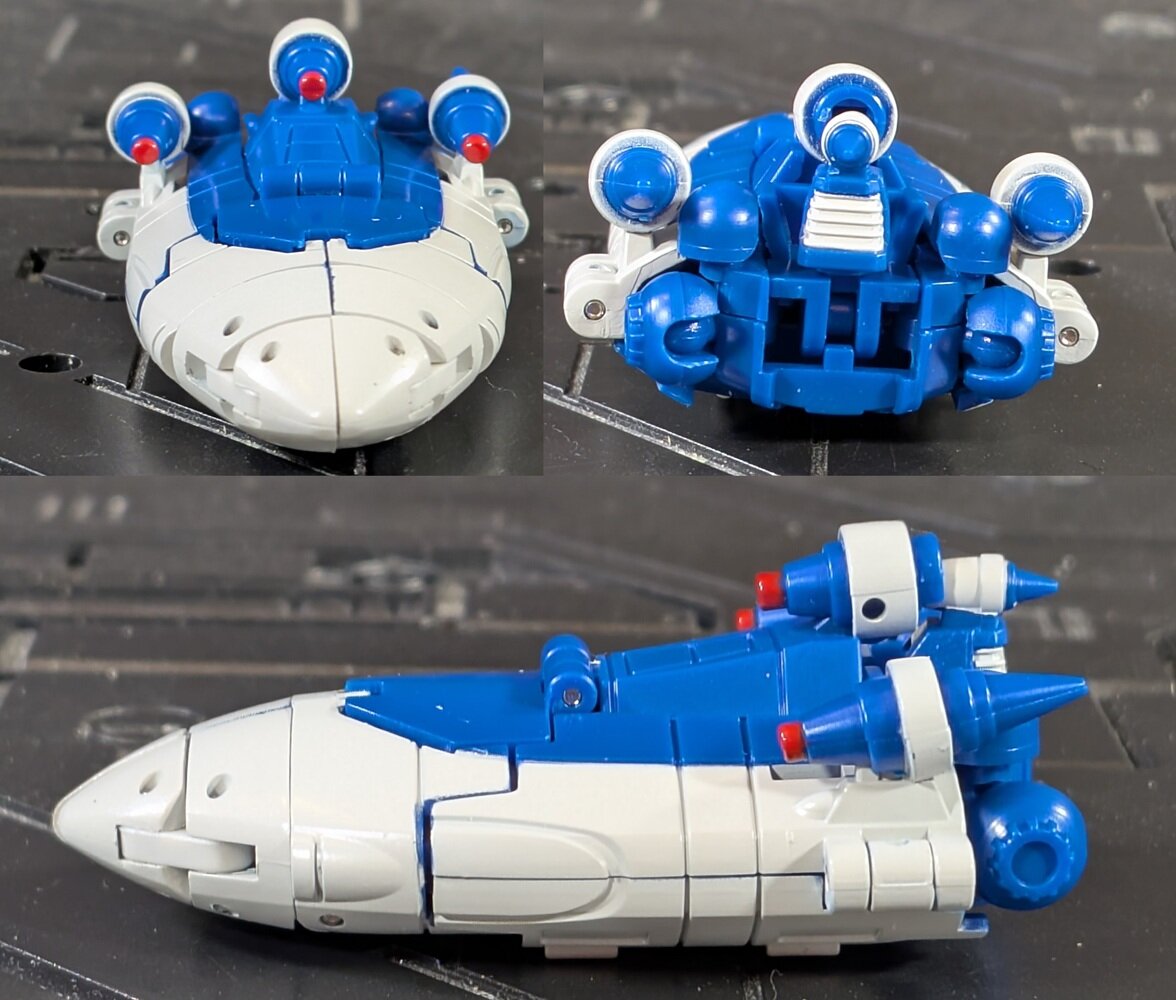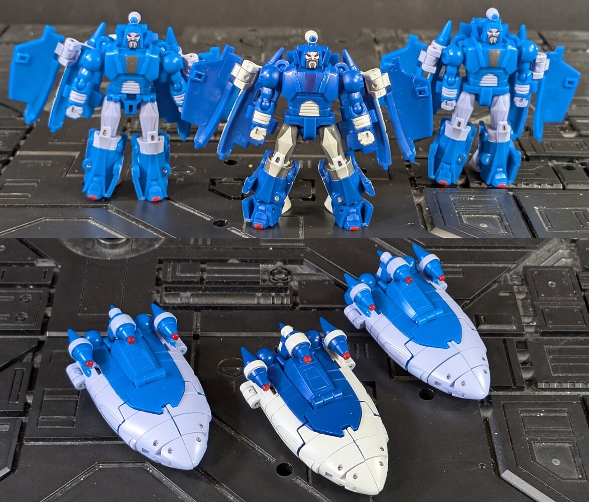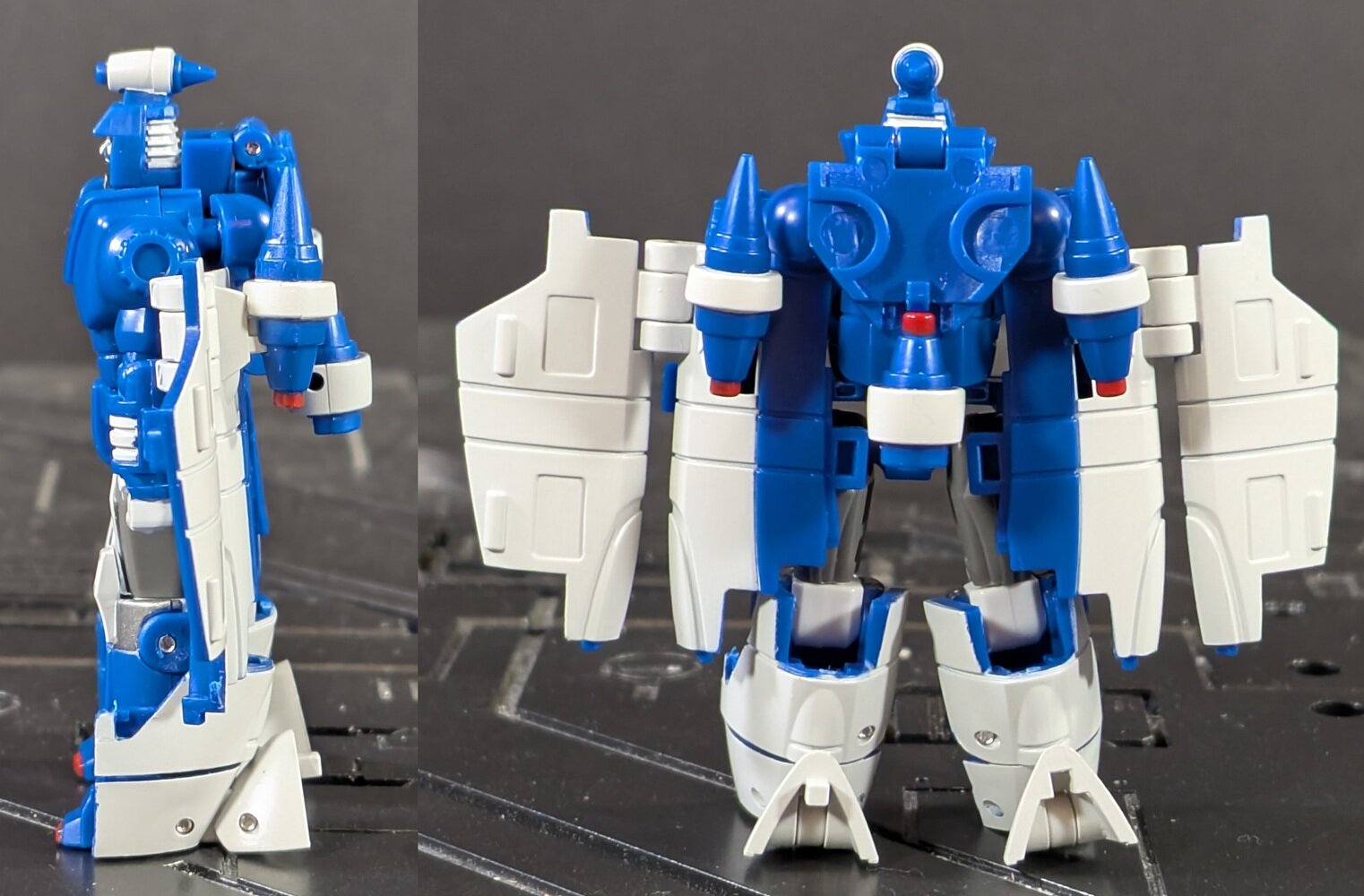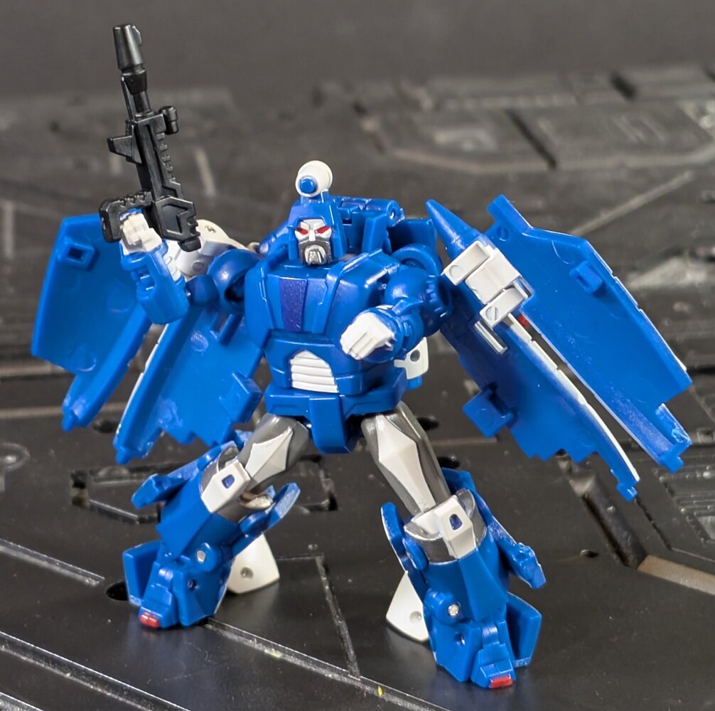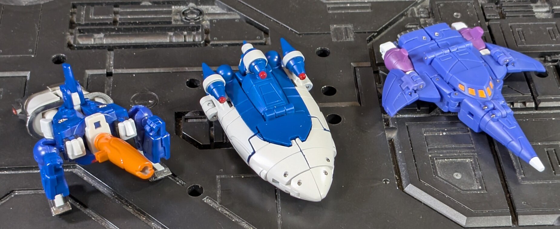 Ever since Dr Wu released his version of Cyclonus I've wanted him to do Scourge, too, to complete the trio of new '86 Decepticons. Fortunately, I didn't have to wait long. This is Star Shuttle, Dr Wu's take on Scourge. Putting Star Shuttle with Destroy Emperor (Galvatron) and Wingman (Cyclonus) really show how far the good doctor has come along since starting the Extreme Warfare line. Destroy Emperor looks positively primitive next to his henchmen! But I personally think that Star Shuttle is a bit more sharply sculpted than even the relatively recent Wingman. As good as he looks from the front, as we spin him around we do see quite a bit of alt mode. You kind of expect that in the wings, but the outsides of his legs and his backpack almost completely hide his robot form when viewed from the back. Once again, though, I'm inclined to cut some slack to a toy that's shorter than a tube of Chapstick and costs about as much as a Deluxe despite coming packed with a second figure. This time he even comes with a weapon! To be totally clear, I'm not sure if every copy of Star Shuttle will come with a gun. The impression I got was that this is a first run/preorder bonus. Star Shuttle's got pretty good articulation for his tiny size. His head swivels, no tilt. His shoulders are ball joints that swivel and move laterally 90 degrees. His elbows are ball joints which bend 90 degrees and double as bicep swivels. His wrists don't swivel, but his waist does. Hips are ball joints that go 90 degrees forward and laterally, and nearly 90 degrees backward. He has actual thigh swivels just above his knees, which are hinges that bend 90 degrees. His toes have some up/down tilt, and his ankles can pivot 90 degrees. His wings are attached via ball joints, so they can spread and flap for more dynamic poses. Star Shuttle's tiny hands are too small to practically have peg holes, so instead the handle of his gun is sort of like a c-clip that clamps around his fists. Star Shuttle's transformation borrows more from the G1 toy than the Studio Series one, with his legs turning inward and his heels folding down to make the front of the vehicle. His backpack spins 180 and a flap folds out to fill in the gap around his thighs. His shoulders shrug up and his forearms turn to plug into his cape, which then wraps around to tab in near his waist on the underside. Then his head turns 180 degrees and flips up, collar and all, so his head crest plugs into the middle engine nacelle. I think his alt mode came out pretty well, turning into a solid, swooshable little representation of the 3-engined, aerodynamic brick we all know and love (or hate, not judging). I think the biggest knocks against it are the visible shoulders and ball sockets on the wing joints. To a lesser extent, the hinges on the backpack flap and wings also seem relatively larger than they might on a Studio Series or Masterpiece figure, but it's the tradeoff necessary to make a figure this tiny that's also durable. With no wheels to roll on, not alt mode weapon storage, and no moving parts the alt mode doesn't actually do much, though. I guess it doesn't have to. And if troop building is your thing (at this price, why not?), good news! While the Scourge version of Star Shuttle comes packed with an entirely different fellow we'll talk about next time, you can also buy a two pack of Star Shuttle with a brighter blue plastic and a very pale blue in place of white, so Scourge can hang with his Sweeps. And yeah, everything I keep saying in all my other Dr Wu reviews applies here. They're not mini Masterpieces the way Newage or Magic Square make their figures. They're relatively simple, relatively cheap Micromaster-sized figures that do a great job of making your Titans and Combiners look even bigger. Their small size and small price also makes them easy to collect. So once again, yes, I recommend Star Shuttle.- 9378 replies