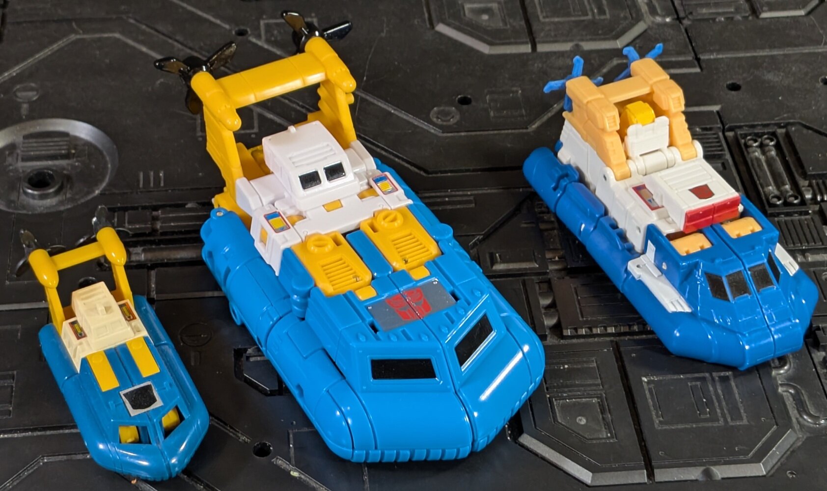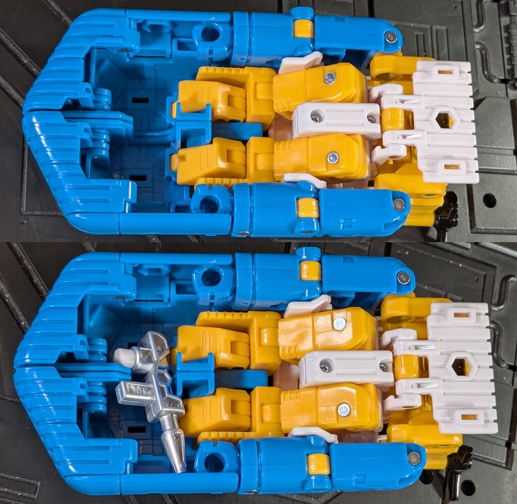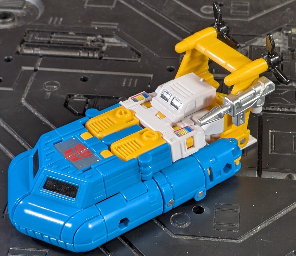 After watching Legacy get progressively worse and worse over its three year run, I'm feeling like 2025's been a pretty great year for the brand. Age of the Primes brought us Vortex and the Aerialbots, not to mention a number of the mythical Primes the line is named for, including a very excellent modern Star Convoy. On the Studio Series side we got a whole new Devastator, a cool Deluxe-sized Optimus to fight him, and an impressively cartoon-accurate Megatron despite turning into a tank. What more could we ask for? Well, a new Deluxe Seapsray, for starters. It's a little weird that third parties have dipped into the Seaspray well many times (iGear, Maketoys, ToyWorld, X-Transbots, Magic Square, NewAge, and Dr. Wu have all done a Seaspray, and Fans Toys has done him twice) but in the last 40 years we just had the original (and the G2 repaint) and Titans Returns (unless you count the Bayverse one). Hasbro's finally giving our boy a proper Deluxe-class glow up... in a Walmart-exclusive line of decos based on the G1 toys. *sigh* It's like Velocitron Cosmos all over again (though Cosmos did eventually get a re-release in Legacy, perhaps Seaspray will be more widely available later...). The "retro" deco fortunately isn't all that far off from the cartoon, though. I'd imagine a purely Sunbow deco would put an Autobot badge on his tummy while losing the painted "stickers" on the sides and the black windows. Maybe use a slightly darker blue plastic. And they'd likely do a different head without the vents and with blue eyes on gray instead of a blank black visor. Those are the sorts of details that are just changed enough to get me to re-buy without making me feel like the retro deco isn't good enough for now. Seaspray's sole accessory is a rather generic gun. It's very hollowed out, but painted silver and does the job. Seaspray's head is on a ball joint, though there's very little tilt available, and swiveling his head is awkward with the propellors in the way. His shoulders swivel and move almost 90 degrees laterally. His biceps swivel, and his elbows bend over 90 degrees. His wrists can tilt up and down a little for some reason, but they don't swivel. His waist does have a swivel, however, if you bend his hips it'll get caught on the white armor on his hips. Speaking of hips, he can move them 90 degrees backward or laterally, but he's again limited to only about 45 degrees forward due to the collision of the white hip armor and his torso. His thighs swivel, and his knees bend 90 degrees. Despite how you'd think he transforms, there's no up/down tilt on his feet, and his ankles only pivot about 30 degrees. Seaspray holds his gun just fine in either hand. He's also got 5mm ports on the outside of either forearm, on either bicep, under each foot, and on his back. While these ports might work well with old Weaponizers or Junkions or whatever, the "magazine" on Seaspray's gun is longer than the 5mm peg, so in bot mode his gun can't really go anywhere but his hands. Seaspray's transformation is weirdly complicated, sometimes unnecessarily so. Like, ok, his spine has to bend backward to tuck his pelvis and shorten his legs, and parts of the floaty bits fold out from under his feet so that they're not too big in bot mode. We're used to seeing stuff like that. But, why do his arms have to swivel 180 degrees? Why is all the yellow stuff around his head on multiple hinges that extend it out from his body before turning the propellors? Regardless, the alt mode is mostly good. His shins are properly visible on the top, and there's an Autobot badge where the G1 toy had a rubsign. Things do get a little messy toward the rear, where the extended yellow bits don't even tuck his head in as well as the G1 toy did, stretching everything a bit too far behind the blue and capping it with a random white flap that half-heartedly covers his face. Seaspray's propellors can spin. He lacks any kind of wheels to roll on. While Seaspray does have two 5mm ports on either side, again, the gun can't really plug into them. Hasbro's solution is to put a small peg on one side of the propellors. This mates with a port on the side of the gun. Which is fine, but... ...there's a TON of empty space under his feet. More than enough that his gun could have stored totally out of sight, if Hasbro had just has the presence of mind to design some way for it to have secured under there. As I prefer hidden weapons to weapons randomly stuck to their Earth mode "disguises," this is a huge missed opportunity. Seaspray is... well, if I'm being honest, a tad disappointing. Don't get me wrong, he's the best Seaspray Hasbro's done (in a Sunbow style), and short a hypothetical but likely toonier repaint probably the one you want on your shelf. But I can't shake the feeling that they tried to get a little too creative with the engineering while not leaving themselves enough time to polish it. If they would have simplified a few things, refined a few other things, and made a way to store the gun under the feet, they would have been flirting with greatness here. As it is, you'll have to make due with "pretty good."- 17738 replies