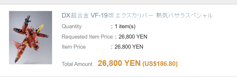Yeah, it's painfully obvious how much HLJ is overcharging on this. Just straight up 30%. To ship just the VF-19 with FedEx would total about $130, with a rough breakdown of $50 actual shipping, $75 duties, and $5 extra handling whatever. I've got until April to ship it, so it's staying there for the foreseeable future. I'll see how much AE wants to charge me to ship it along with my HMR VF-19P, but I am still not keen on using DHL for anything.