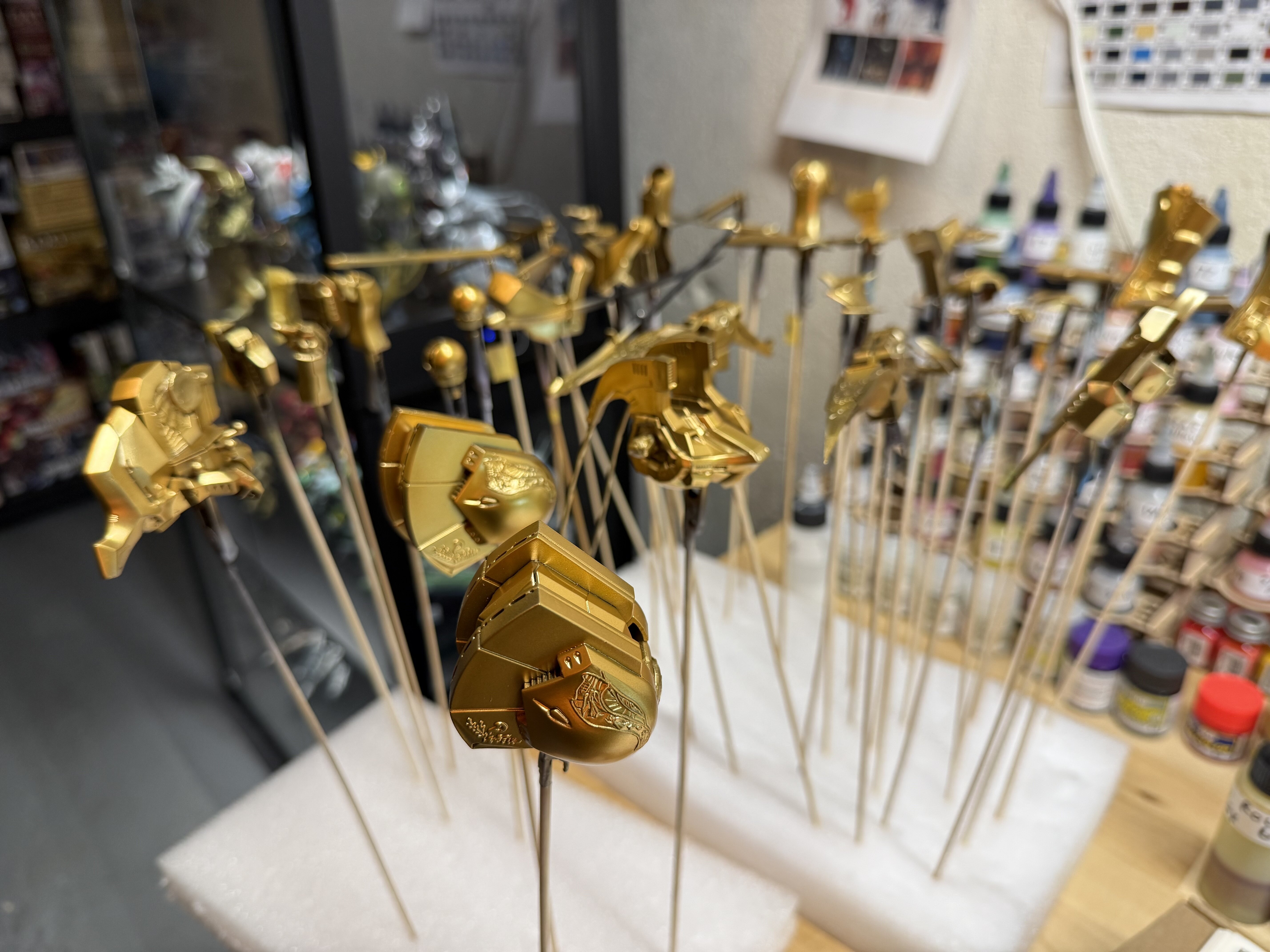 Thanks. It’s going to be a fun one. Hail Satan! I can only listen to Merciful Fate while I build this one. lol Tonight I was able to get back to business on the KOG over the 7777. Got most parts painted tonight. Cockpit is dialed and just needs to dry before masking and final layer of gold tomorrow. Then it’s time for brush painting details throughout including some very cool pauldron scenes with angels ascending towards a gateway. Very tiny and two per pauldron. oh and I almost forgot. I got to spray that Gaia Star Bright Gold. I did two light coats and it came out really nice. Was thinking about a third but I’m happy with the two. Honestly I was just lazy and want to go to bed. Zzzzzz