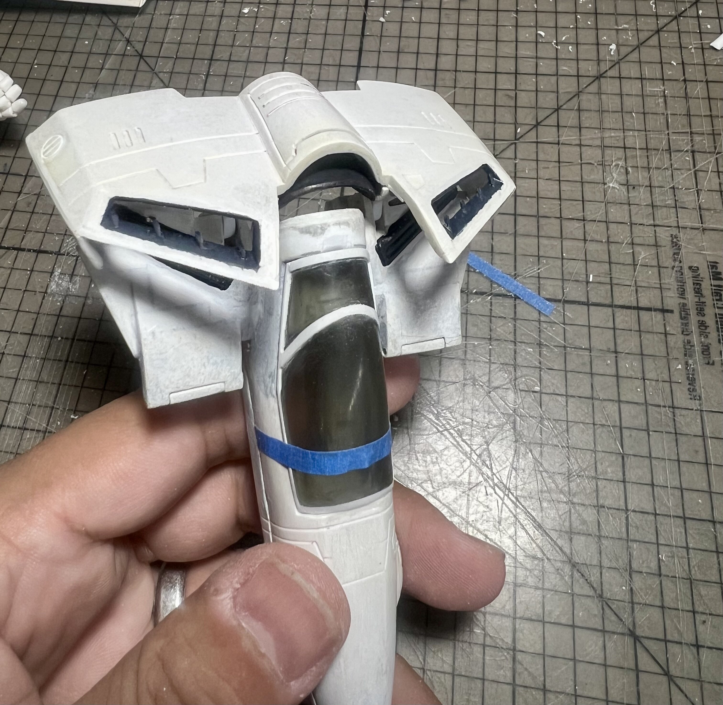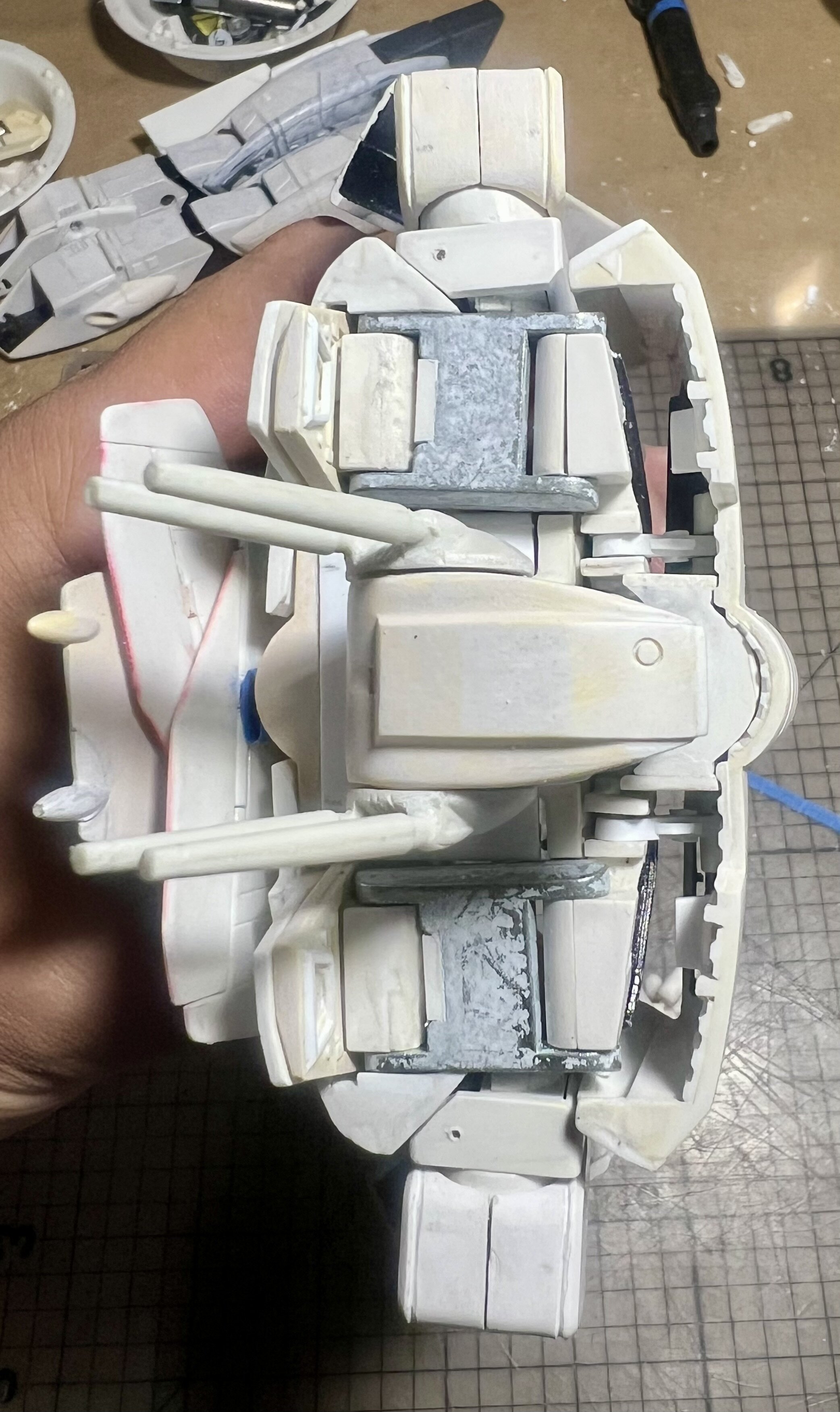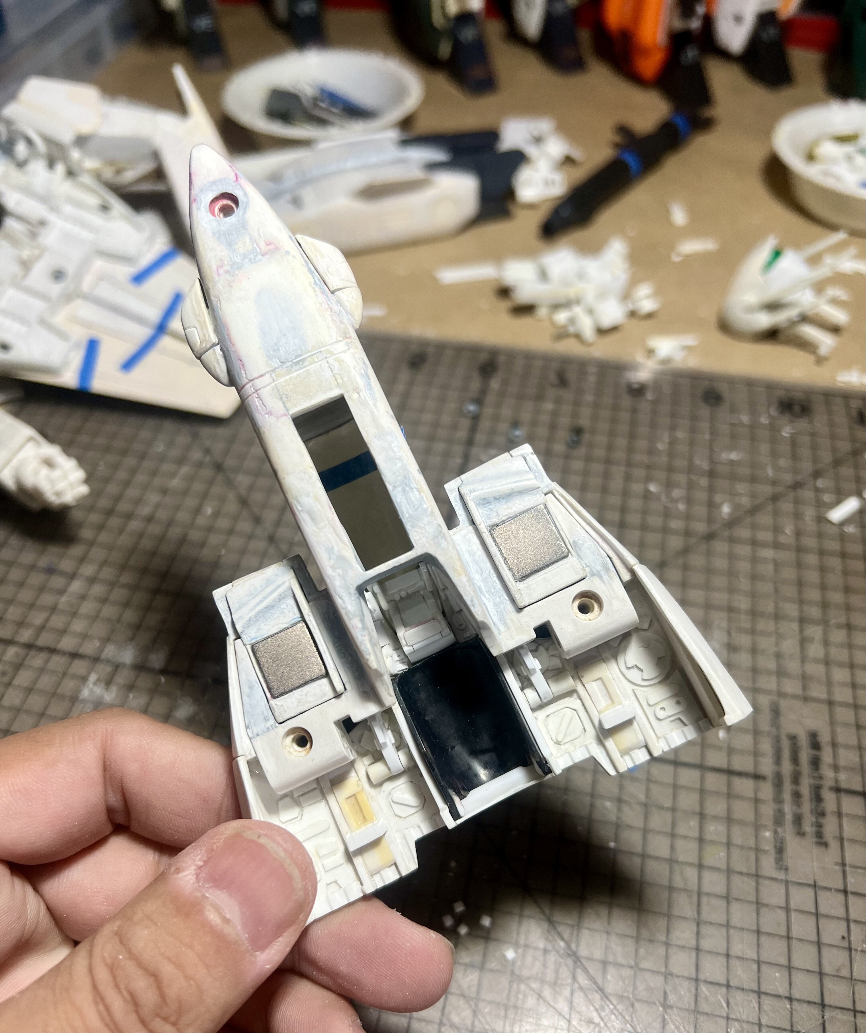 Finally. Upgraded my chest hinges. The originals did an amazing job, but I can see they were never meant to last. But these little buggers are what set off a tirade of improvements. Note that I can just hold the cheat plate and the nosecone stays in fighter mode. Finally, gotta love the capabilities of this neck. Reminds me of a certain box art. -