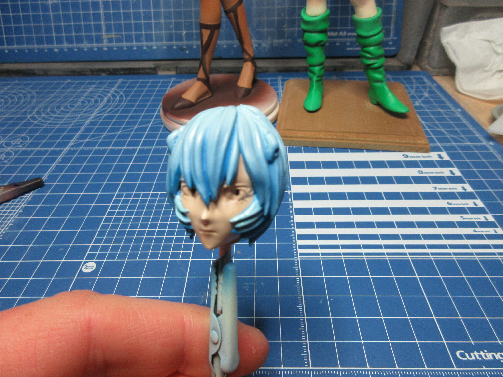 Thanks, guys! Thom, you've gotta watch Record of Lodoss War. The original OVA by Madhouse is legendary, with incredible vocal opening and ending themes. I normally don't care about anime vocal music, unless it's Macross, Lodoss, and BGC. The OVA was done before the novels were completely written, so its ending is considerably different from how it was meant to be. Later there was a Lodoss TV series that mostly glossed over the events of the first story arch, then it covered the Leylia redemption arc. The second half revolves around Neece's capture, who is the daughter of Leylia and the wizard Slayn from the first story arch, now a teenager. The sorcerer Wagnard captures Neece to sacrifice in an attempt to resurrect the Goddess of Destruction, Kardis. In the OVA version, Wagnard captures Deedlit to sacrifice to Kardis and Parn must rescue her. Unfortunately, there is no clear-cut way to just sit down and take in the entirety of Lodoss and have it make sense. The OVA is all about Parn's hero's journey. But only the TV show features the "next generation" characters. Chas, I'm pretty happy with how Deedlit's hair turned out. I've only temporarily attached her head because her cape needs to go on first, and then her head/hair. I also need to attach her side locks that go on in front of her ears. I'm also working on a 3D-printed Rei figure. I first airbrushed her skintone, then masked it off and airbrushed her hair Mr. Color 34, sky blue. I managed to find the official Rei hair color by Gaia Notes. It's too light, I think, so I just sprayed it from a top-down direction to provide a gradation.