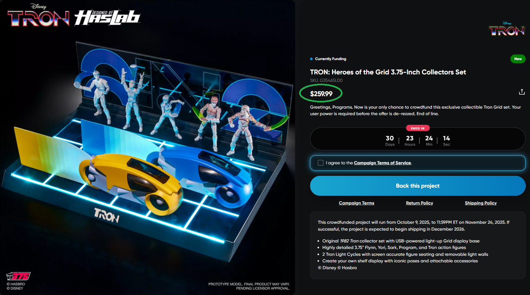 And yet this is what they came up with. At that price. They're like a third of the way through the funding period, and they've got barely over 1000 of the 10,000 backers they need. I think it's way overpriced... if these were retail figures, it'd be, what, $20 a pop for 3.75" figures, and say $40 per lightcycle (a bit high, but prices I might be willing to pay, for Flynn, Tron, Sark, and the lightcycles, but to heck with Yori and generic badguy program). That's only about $180. I definitely don't need a light-up base for $80 more. Again, I'd have rather they had an actual Tron toyline with stuff from all three films... they I might get Sam, Quora, Ares, Athena, and Eve, a Legacy and Ares Lightcycle, one of those jet things Athena was flying around in, and some Recognizers.