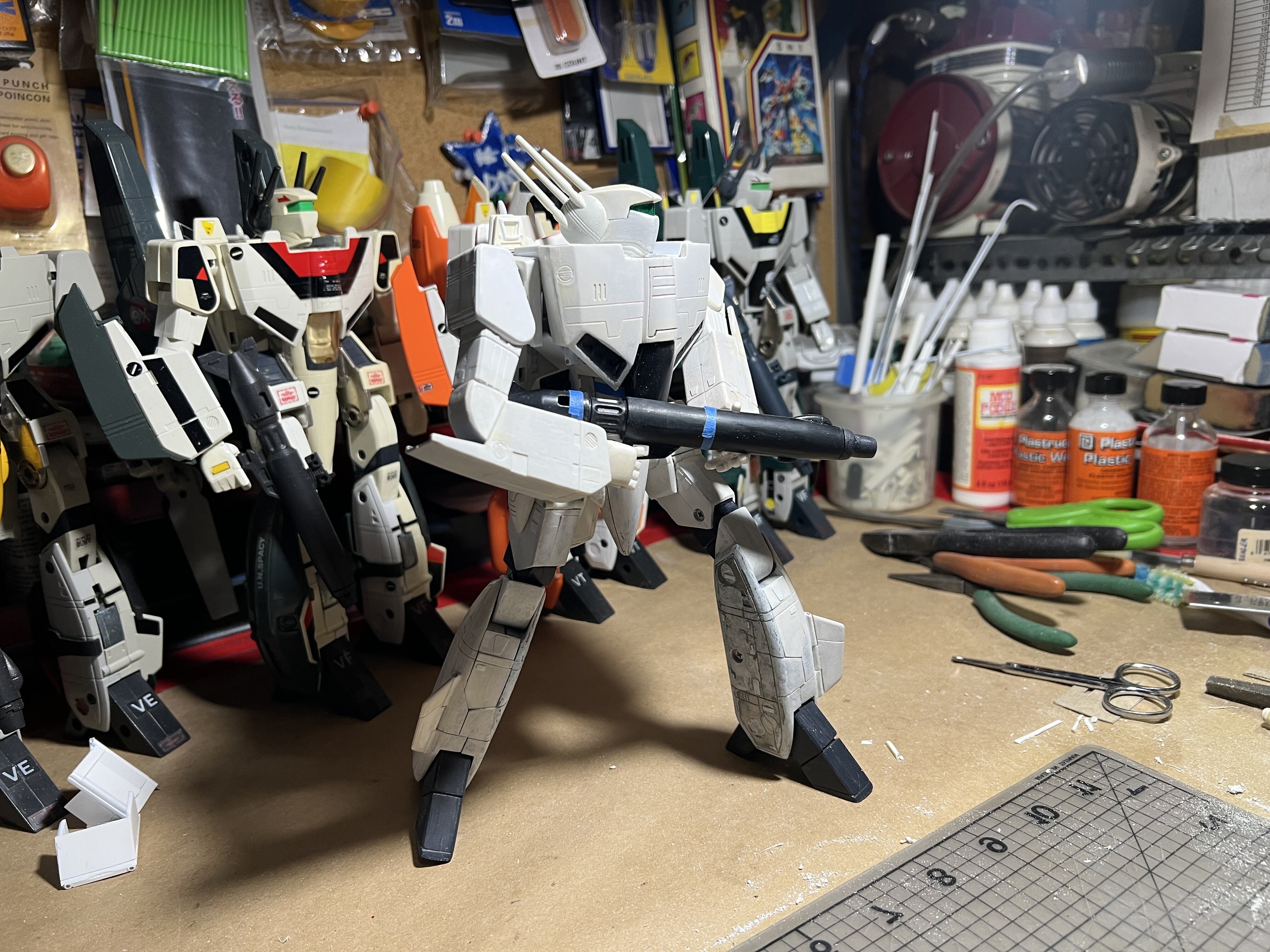 Well, I had to revert back to a more basic style of side covers. The version with the armpit thrusters were not going to look good in operation as half of a door would be missing on each. Oh well. But I was capable of making a much better side cover piece that wraps around the cockpit and sets secure on the body. Still need to add the panel lines and then sides cover is done. Feeling good. -