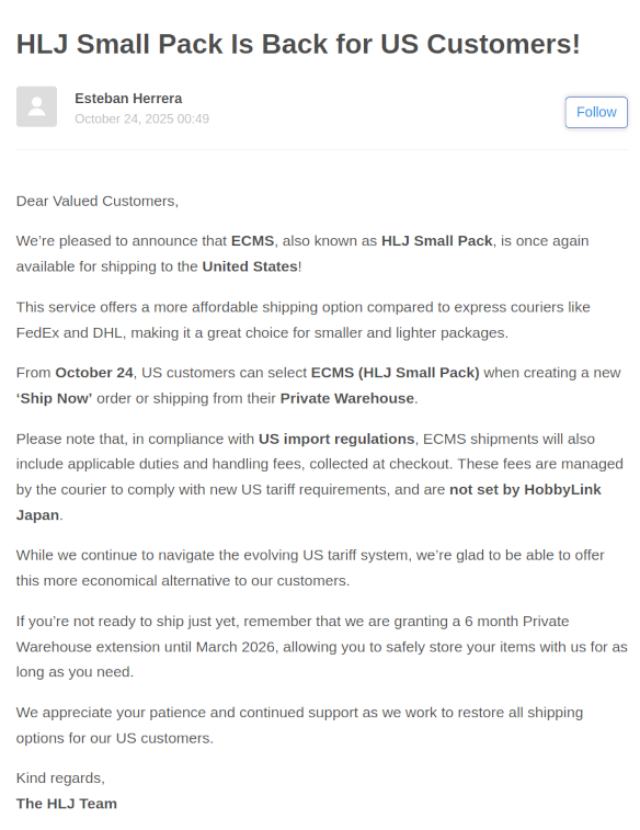 not really sure where else to put this notice for now, but since I preordered the upcoming SDF-1 reissue from them... https://support.hlj.com/hc/en-us/articles/51806261169049-HLJ-Small-Pack-Is-Back-for-US-Customers