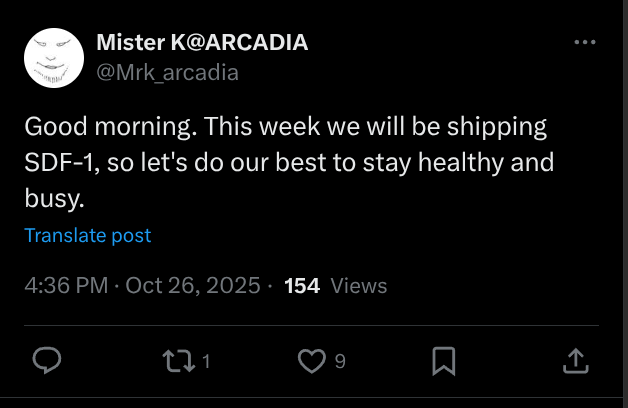 3. Nothing on any new packaging just yet, but Mr.K just officially confirmed SDF-1 is not delayed and will ship soon: https://twitter.com/Mrk_arcadia/status/1982592084805828915 web-translated: