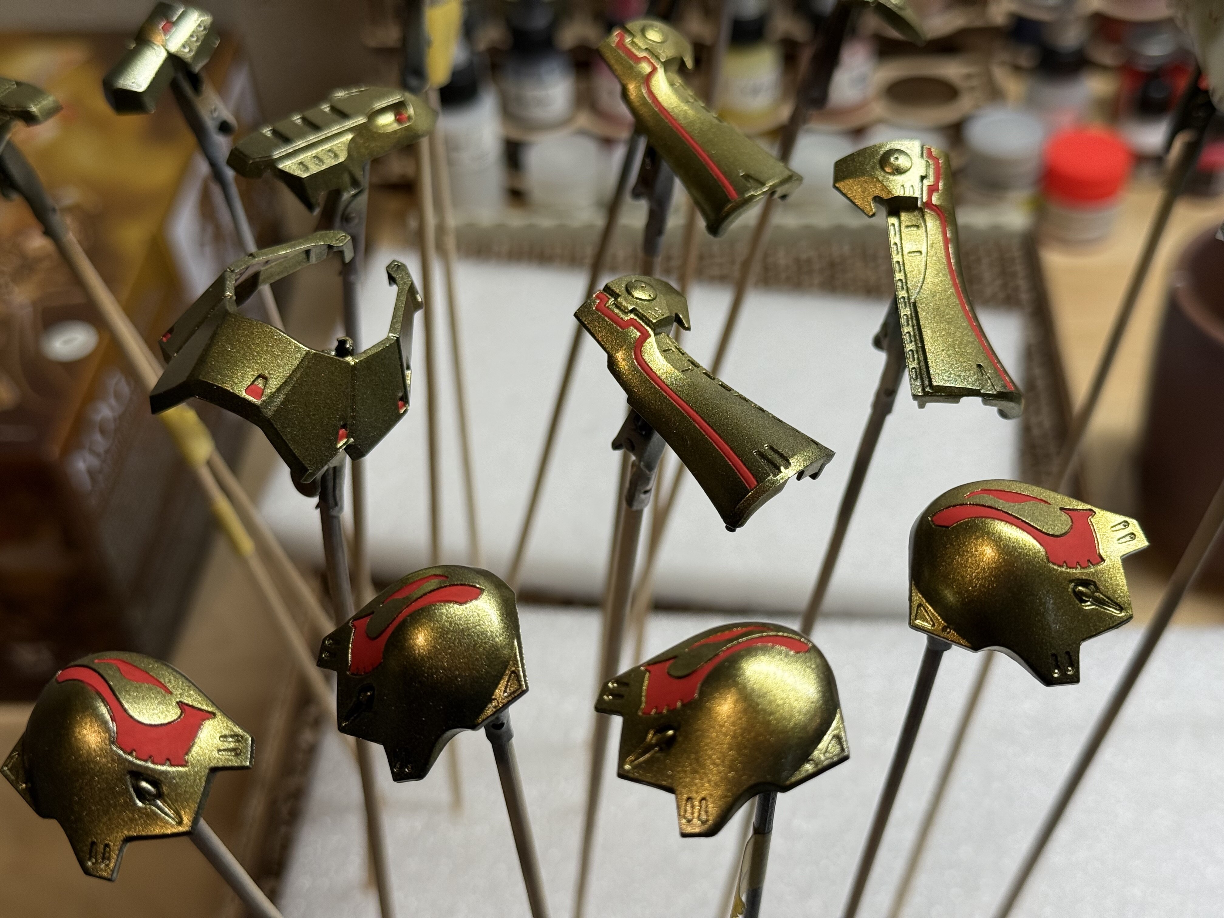 Starting to look like a Motar Head. Now I’m waiting for paint to dry and I need to fiddle more with that scratch build face armor. I haven’t totally committed to it yet. I did reach out to Volks and I might be able to buy a replacement sprue. Just waiting to hear back, but I feel like I could just skip it if the one I made is good enough. I hand painted the red in Vallejo acrylics. I want to put down another gloss coat over it, but read that I should give it 24 hours before I mess with it. Once that’s done I need to do one more layer of brush painting. I guess it’s more like a white enamel panel line outline on the red eye shapes on shoulder armor.