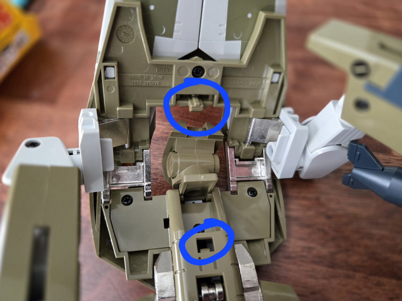 Ok, I’m not sure if I can post a video as easy as photos here but I think I can explain. See the top part circled in this picture? That tab that locks into the hole in the fuselage circled below it, is spring loaded. From the perspective of this picture, you could push up on it. When transforming to Battroid like in the videos you posted, you can see the same tab from a top view through the door that the head fits through and you can press down on it to make tabbing it in easier, and when transforming from Battroid mode, you can open the door and press down on it to release the tab without forcing anything. It’s definitely not obvious unless you know it’s there, which is what makes it another insanely cool feature that I went decades not knowing. I hope that makes more sense now.