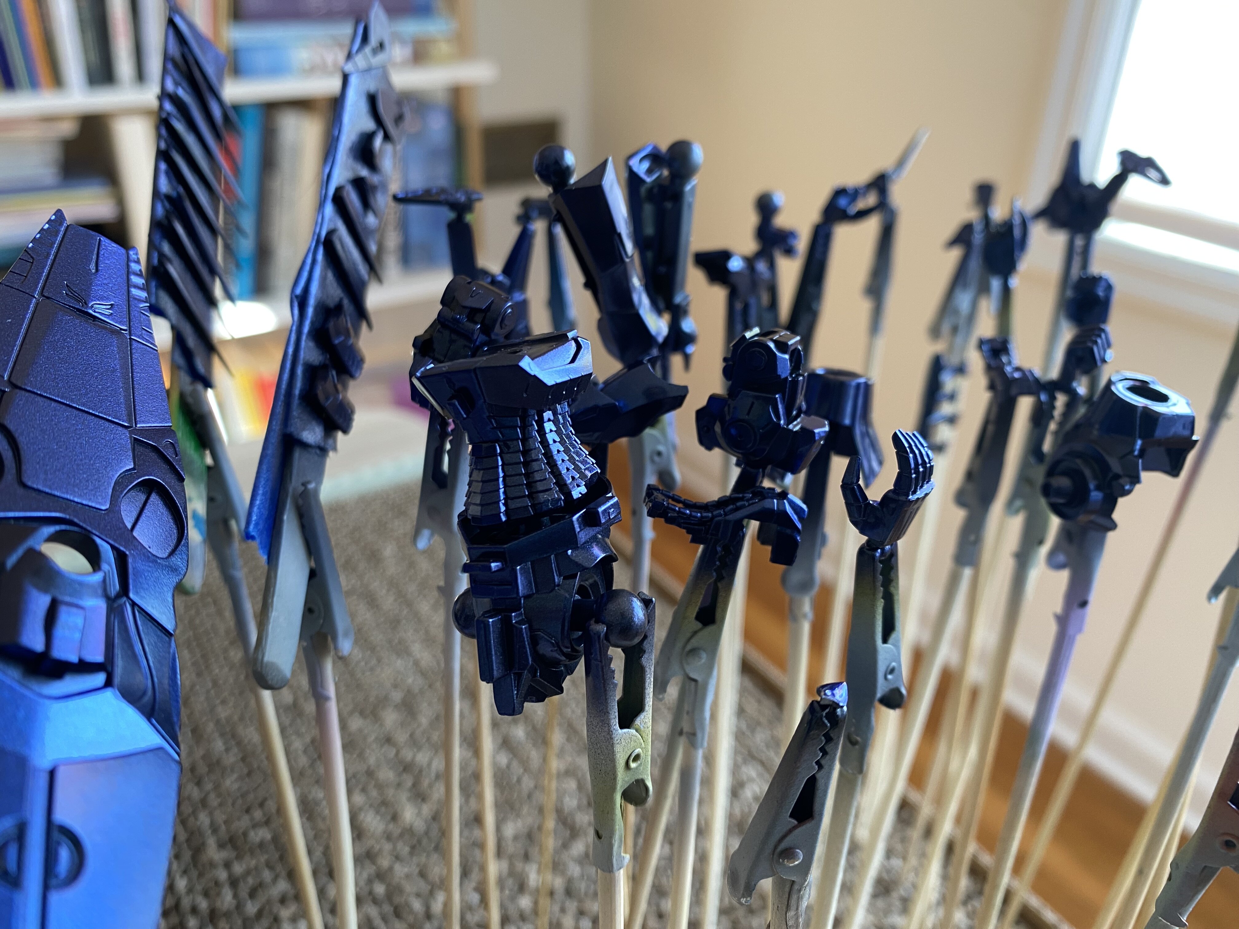 Thinking about your project here (how bug-like it looks), have you considered an iridescent top coat on it? I saw this online and wanted to know your thoughts: https://www.walmart.com/ip/Pouring-Masters-Professional-Acrylic-Pearlescent-Mixing-Effects-Medium-8-oz-Bottle-Create-Pearl-Iridescent-Metallic-Effects-Improve-Flow-Consistency/2340932760?classType=REGULAR&adsRedirect=true It says it can be used as a topcoat to add an iridescent effect to paint (clear, just iridescent). I thought that maybe it would help it look more alien, but you might not want to go that route. Just a suggestion.
