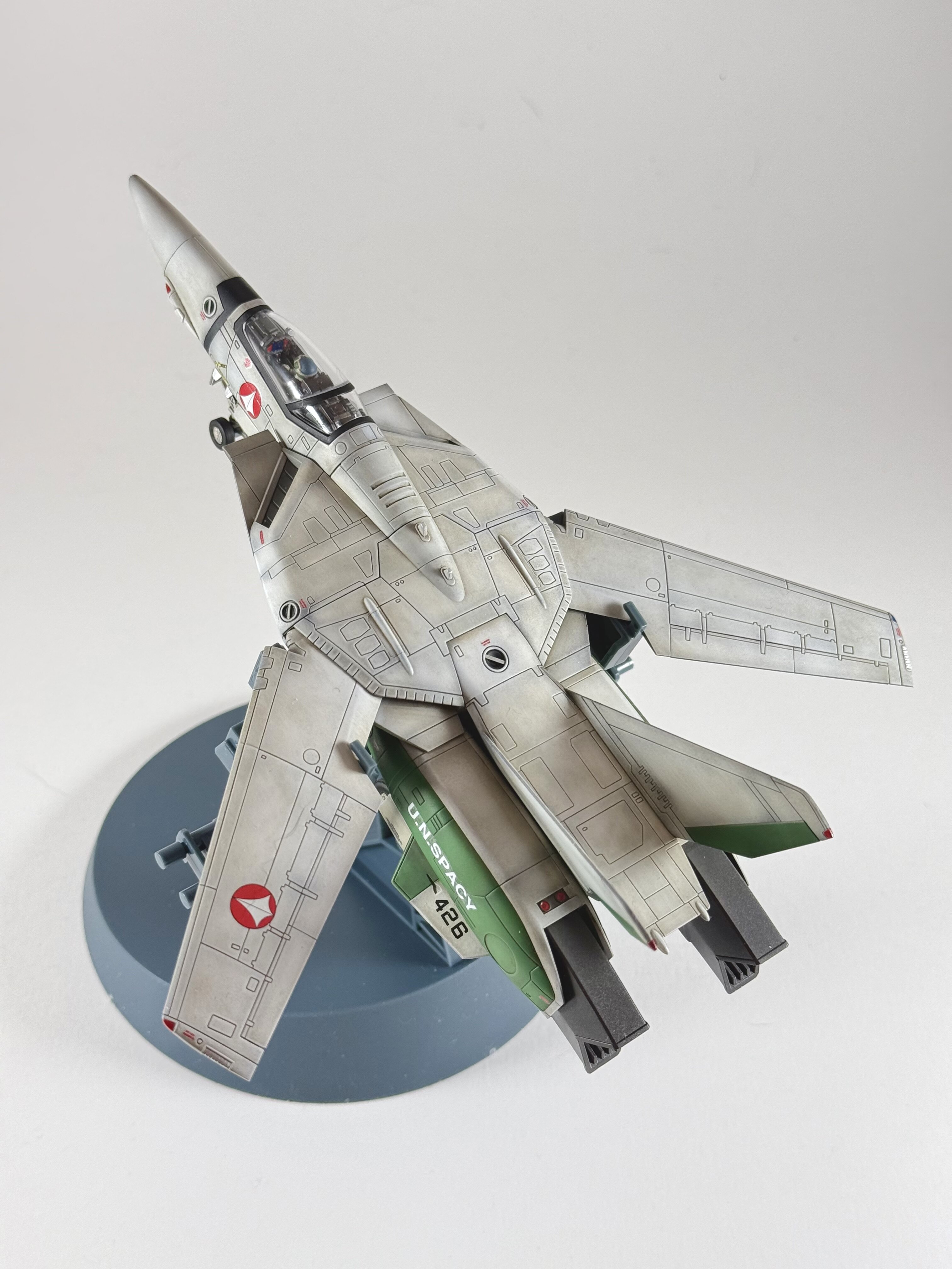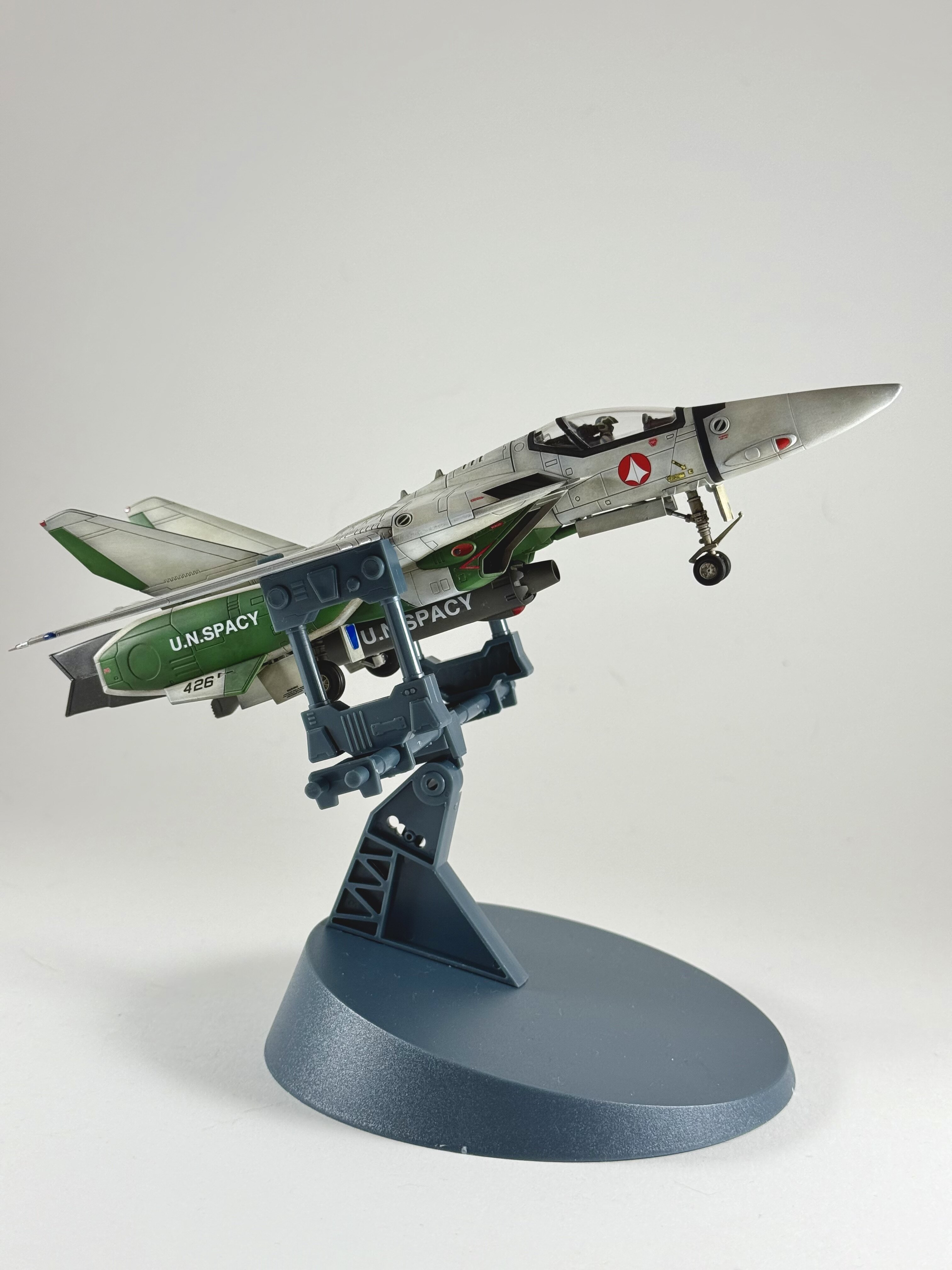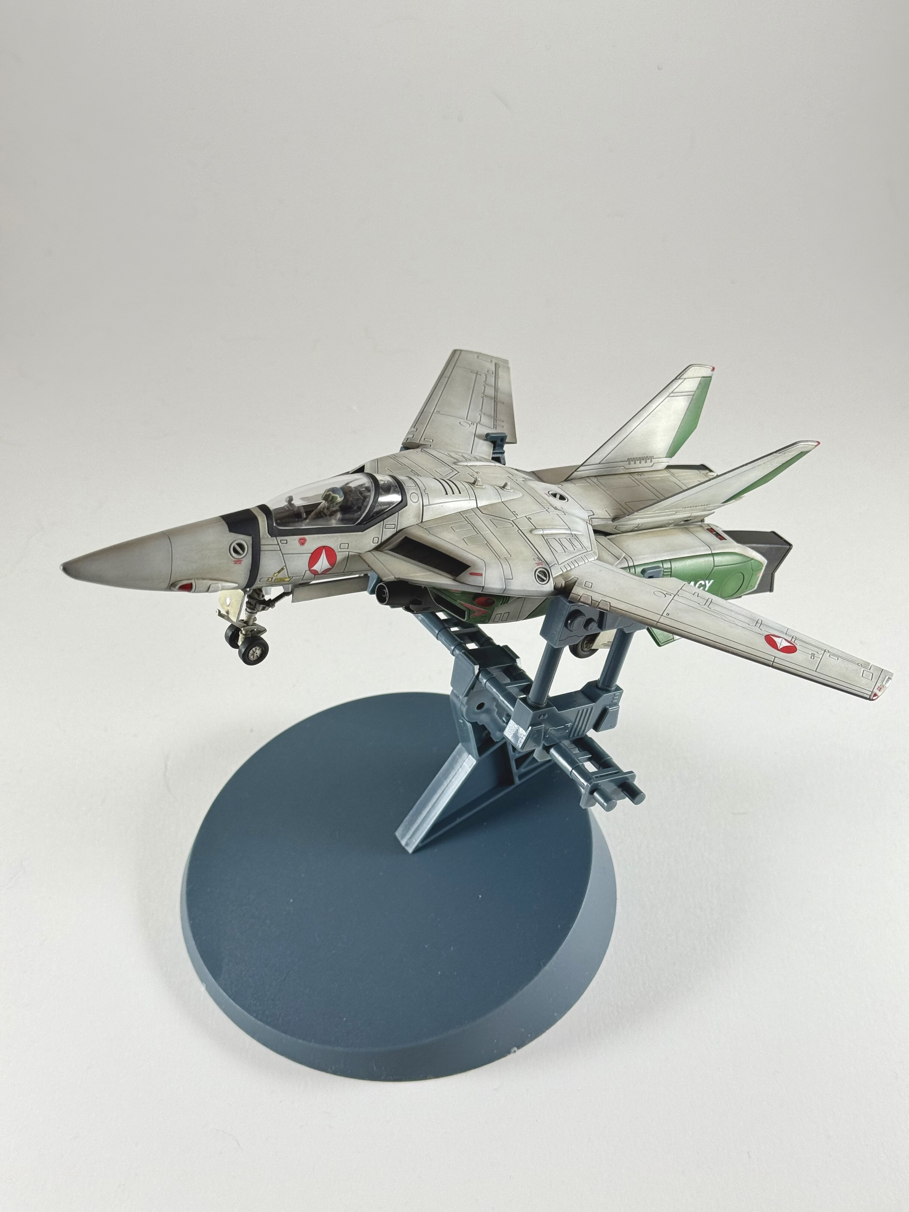Plamax VF-1 Alaska scheme. Just using an unfinished Hasegawa stand for photo purposes. I would like to get a brass rod and make my own stand later. This was a fun one, but think it’s a bit sloppy. 🤷 don’t mind the dog hair 😂