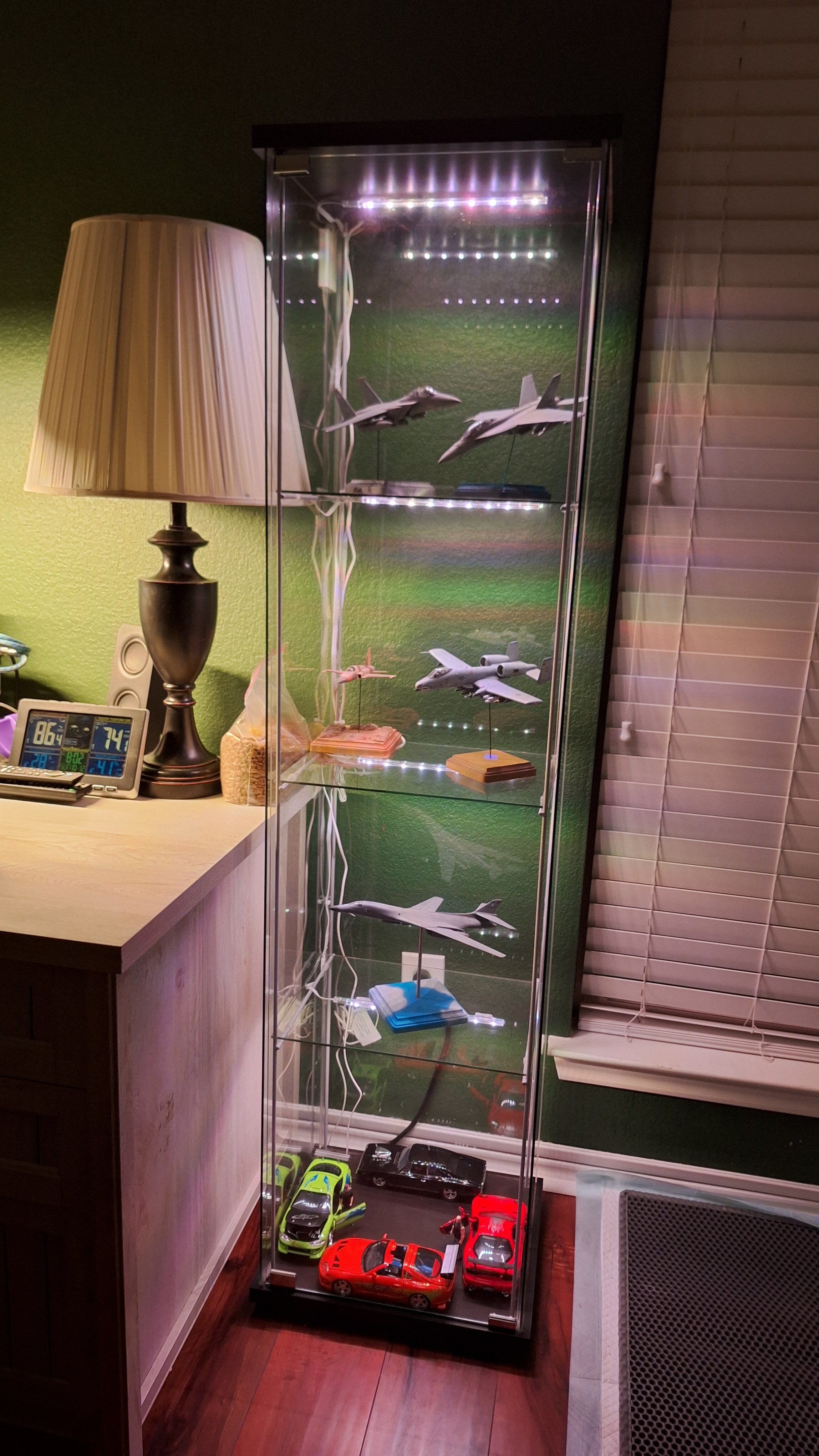 Not exactly ON the workbench, more beside it, but anyway, resurrected one of my two IKEA Deltofs from the garage today and found an extra power supply I forgot I bought like 15 years ago when I bought the cabinets! (Kitten π had chewed through the power cords when she was little years ago so the RGB LEDs hadn't worked since) . I did have tons of Macross stuff in these for years but for now anyway they are going to flank my new hobby desk with recent models/car collections in them!