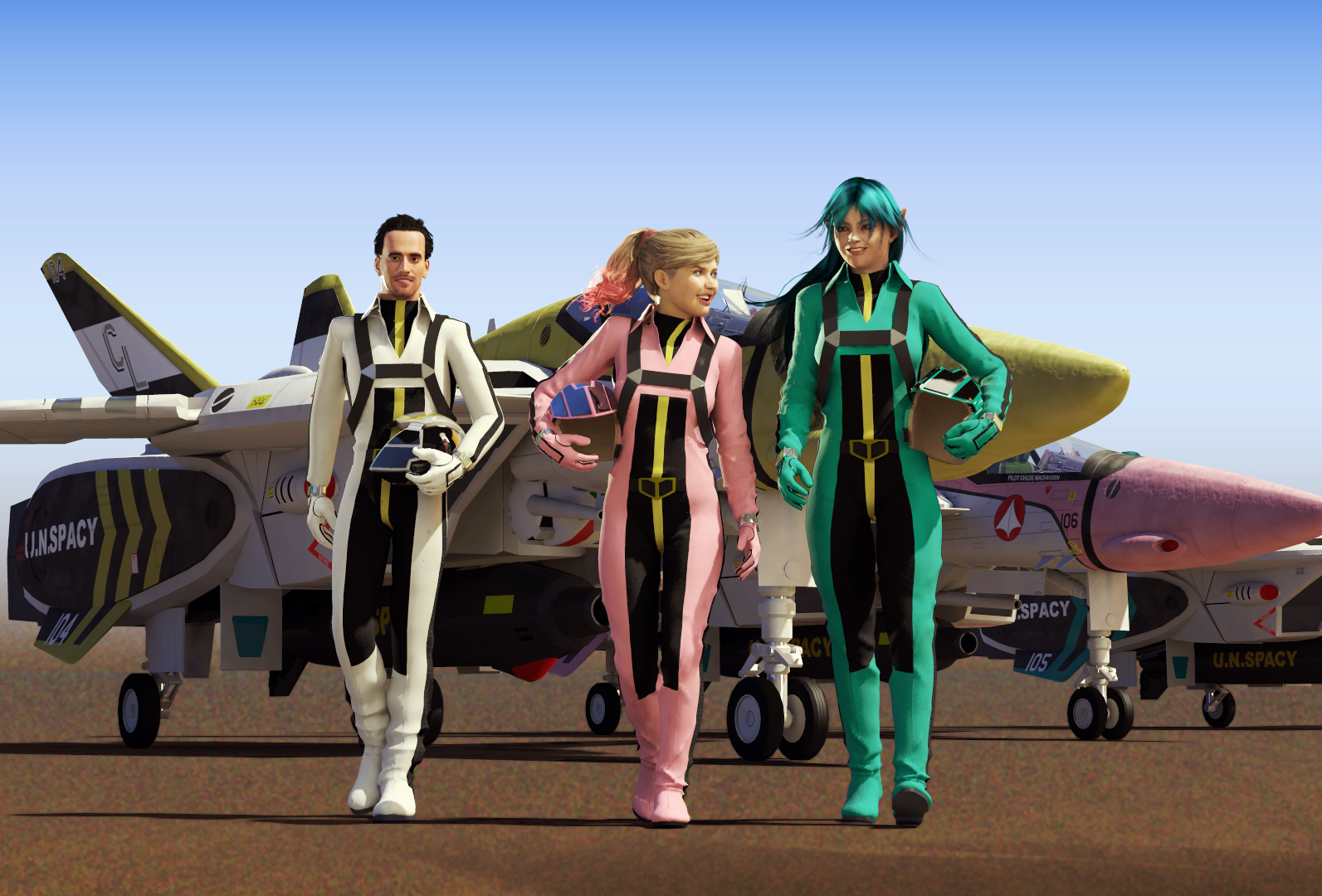Male flight suit is a WIP and will have a wrinkle morph like the women’s suits. Suits, props, figure morphs made in Max and ZBrush. Custom Valkyrie paint schemes shamelessly appropriated and adapted from a scheme in the book Variable Fighter Master File VF-1 Valkyrie. Rendered in Poser and Photoshop.