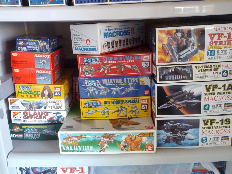 Next shelf.....Hasegawa S strike battroid, Hasegawa A super fighter, Hasegawa S strike fighter, another Hasegawa weapons set, Bandai variable A, Imai valkyrie 4 type S, Imai valkyrie 4 type standard A, Bandai 15th special coating valkyrie 4 type, full box of Macross pencil sharpeners, Arii 1/100 fighter, Arii 1/170 standard A battroid, Testors r.o.b.o.t. S battroid, Testors r.o.b.o.t. S fighter, Imai Misa Hayase, Nichimo remake SDF-1, Nichimo remake Glaug, and on the shelf below Hasegawa S barrtoid