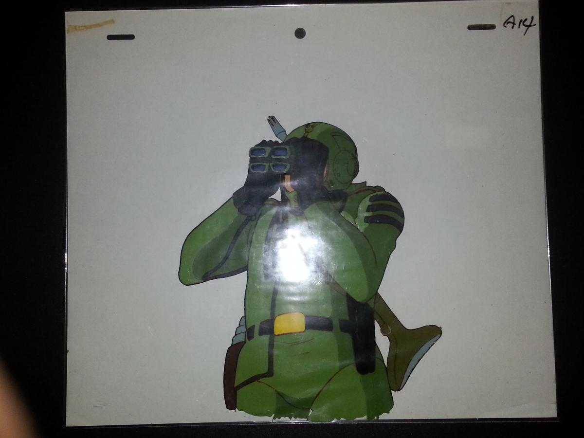 5) Yamato/Star Blazers Sgt. Knox cel. This cel shows Knox in full battle uniform with rifle and looking through binoculars. A good looking cel. ($50 + shipping)
