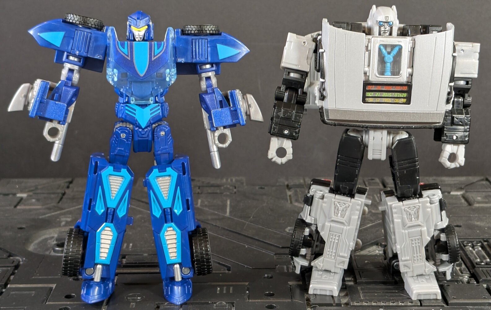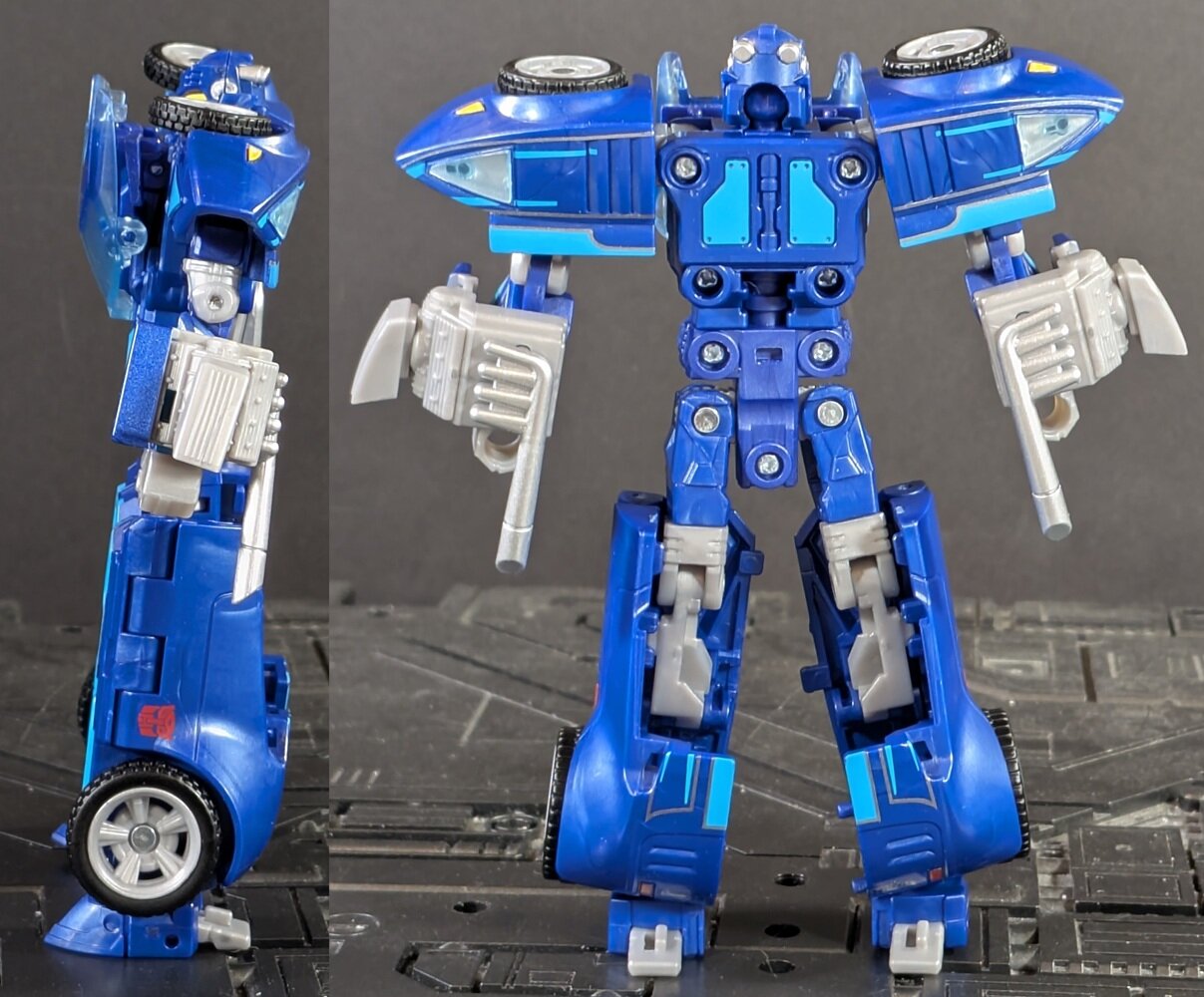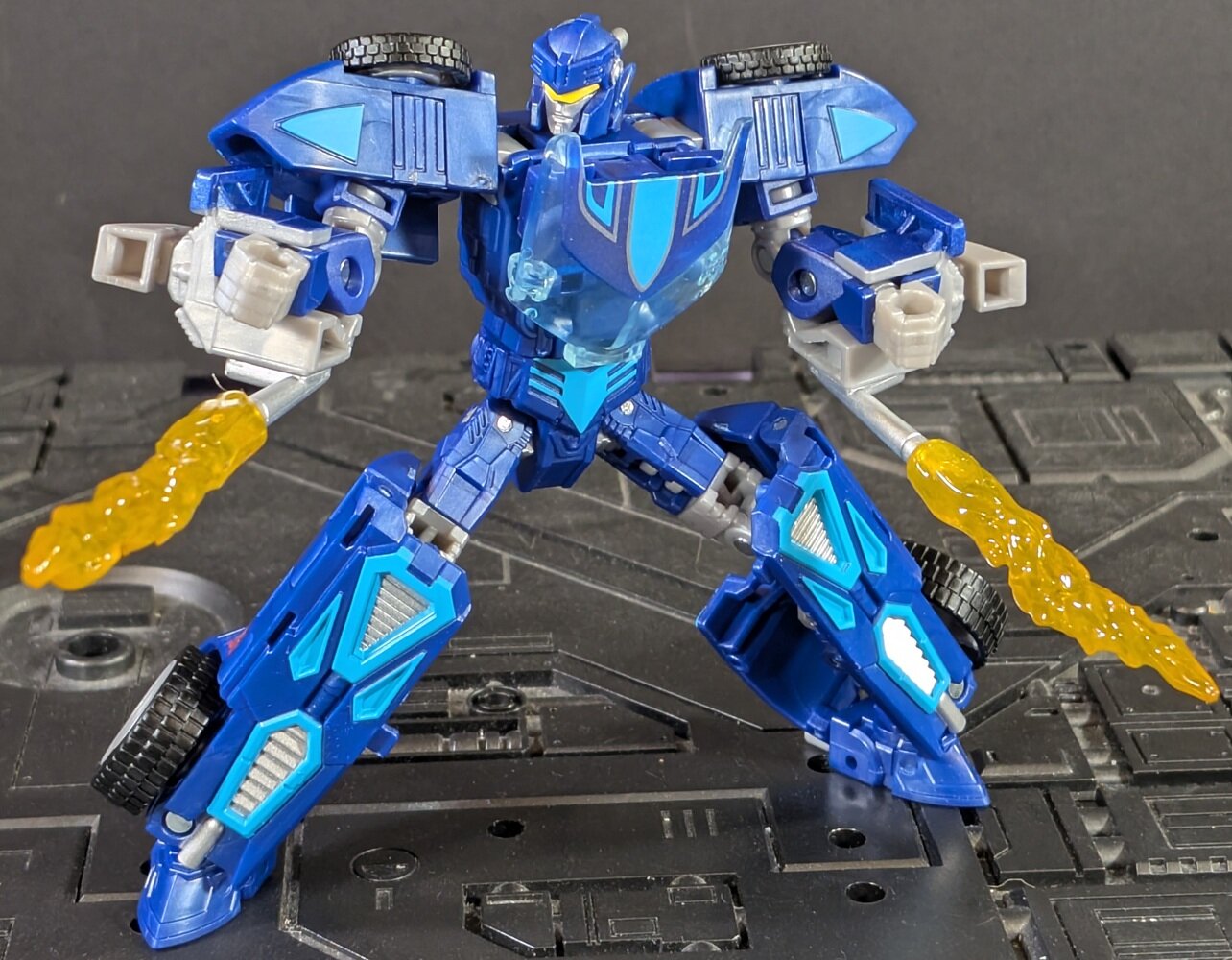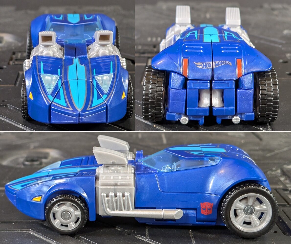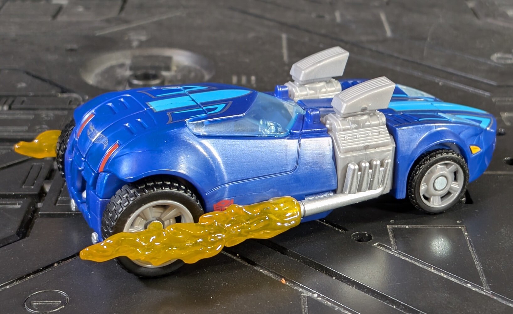 When I reviewed Steelsmash a few days ago, one of my biggest complaints was that a Transformers collaboration with the NFL just doesn't the same sort of sense that pop culture vehicles do. Which is why today's collab feels so right... maybe they don't have the mainstream recognition that, say, the Delorean from Back to the Future does, but Hot Wheels certainly have their place in both pop and collector culture. Taking some of Hot Wheels' most iconic original designs from the last 57 years and making them Transformers feels as obvious as taking real licensed cars and making Transformers out of those. While not part of the original 1968 "Sweet Sixteen," this car is so iconic Mattel actually commissioned a life-sized working version... this is Twin Mill. As Transformers go, Twin Mill isn't a bad one. With his primary blue colors and long, semi-circle shoulder pads I'm getting Cybertron Blurr vibes. The roof-chest is more standard car Transformers fare. And at roughly a Deluxe scale, he fits in pretty well with your regular Autobot crew. Twin Mill maintains a pretty clean appearance all-around, with no backpack and only a minimal amount on his arms. The open gaps in his calves are a bit of an eyesore, though, exposing the inner joints. Twin Mill doesn't come with any weapons... I guess the pipes on his arms are enough. He does come with these two flame effect parts, though. Twin Mill's head is technically on a ball joint, but there's no real clearance around the ball, so he can swivel his head but he can't really tilt it. His entire shoulder can swivel and move about 60 degrees laterally. That lateral movement is really for transformation, though, and on the wrong side of the swivel. Fortunately, his shoulders have additional swivels under the shoulder pads that get a bit under 90 degrees of lateral movement as well. His biceps swivel, and his elbows bend a little under 90 degrees. His wrists swivel, as does his waist. His hips can go over 90 degrees forward and laterally, and 90 degrees backward. His thighs swivel, and his knees bend 90 degrees. His ankles are hinged ball joints, so they swivel, have some up/down tilt, and pivot about 45 degrees. The flame effects have holes on them that fit over the ends of the pipes on his arms. To get Twin Mill ready to transform, you're going to have to partsform him. The sections with the engines and exhaust pipes slide outward to come off of his arms. Does that make them accessories? I think no, simply due to the fact that there's nowhere else to store them. As for the rest of his transformation, it's relatively simply. His arms tuck up into his shoulder pads, which then swivel 180 degrees and fold up to encapsulate his head and form the nose of the car. Spin his waist 180 degrees, and fold out his chest. Flip the trim out from under the window, and rotate the roof 180 degrees. Tuck in his heels and open his calves. His feet swivel so the toes are pointed inward, then they fold up into his legs. The legs tab together then collapse Combiner Wars-style. When the legs are in place, you can rock the roof back and tab it in, too. Slide the engines into the gap between the roof and the nose, and swivel the intakes so the opening faces forward. I'm not much of a Hot Wheels collector... I do have a number of 1:64 cars, but they're all Porsches. That said, as near as I can tell, aside from being a little thicker proportionally and using gray plastic instead of chrome form the engines, rims, and intakes, it's a pretty good representation of the Hot Wheels car. The light blue markings match marking on various Twin Mill releases, with the only concession to being a Transformer coming from the Autobot badges in front of the rear tires. I guess, if I was being really picky, I'd also point out that the swirly blue plastic Hasbro used is a poor substitute for Mattel's "Spectraflame" paint. Of course, the flame effect parts are meant to be used with this mode, too. In fact, there's a curve to them that allows them to curve around the flared rear, so they only fit a certain way. As I kind of alluded to, I really like this collab. Yes, Twin Mill is an iconic Hot Wheels car, but there's nothing about it that makes it stand out dramatically from other Transformers in either mode. If you're into Hot Wheels, it's cool to see Twin Mill brought to life this way, but even if you're not into Hot Wheels it's just a solid robot with good articulation that turns into a solid car fictional car. The only catch is the price. He's Deluxe-sized, with minimal accessories, and nothing about his paint seems to push the budget higher, but he's priced more like a Voyager. But, I guess Mattel has to get their cut, eh? If you can swallow the price tag, I give Twin Mill a solid recommend.- 17885 replies