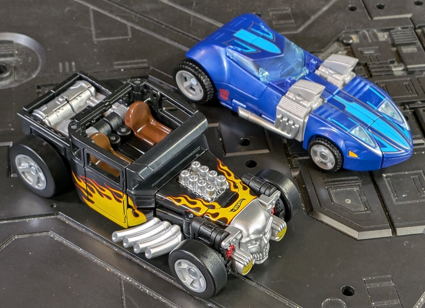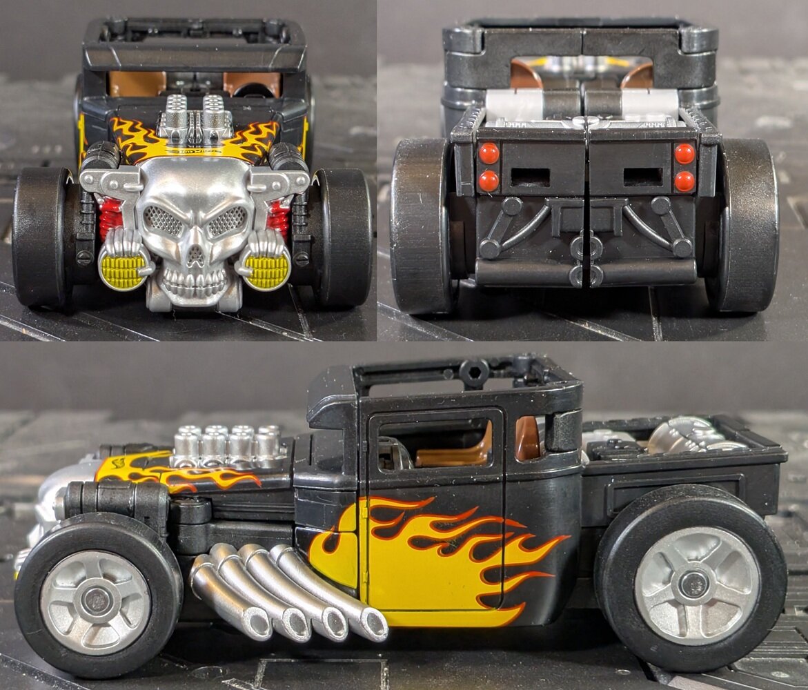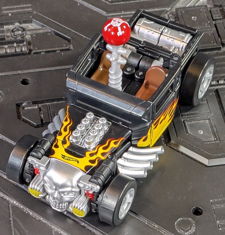 Despite not being nearly 60 years old like Twin Mill, Bone Shaker, first released in 2006, seems to be nearly as iconic. It also had a life-sized working version commissioned, and has appeared in several Forza games. And now it's a Transformer. Bone Shaker is kind of like the opposite of Twin Mill. Yesterday I praised Twin Mill for blending in with other Deluxe carbots due to his somewhat typical design and lack of overly Hot Wheels-esque elements. Bone Shaker's giant skull chest is instantly recognizable to Hot Wheels fans, though, and the bot it's attached to clearly has no interest in blending in. And yet, it totally works. Combined with his red eyes and face that managed to look angry even with a mask, Bone Shaker is a bot that oozes attitude. But not in a "I'm something else being shoehorned into Transformers way," like the pizza van from Stranger Things or a football helmet. More like in a Lobo or Deadpool way, like you stuck him in a comic book with the regular cast and he gave off so much main character energy you had to give him his own series. That attitude does come with a few drawbacks. He's not as clean as Twin Mill. The wheels aren't really his shoulder pads, they short of hover above his bare shoulders, with flaps of kibble tucked half-heartedly behind them. A windshield that doesn't fold at all sticks off his back. And his feet kind of aren't really feet. Like the front of his "foot" is actually part of his shin and doesn't move at all, while the flat bottom does move but is kind of just a flap. Bone Shaker's sole accessory is this... I guess mace. There's something like a skull and crossbones on it, but instead of a skull it's an Autobot badge. The packaging does suggest Bone Shaker's supposed to be an Autobot, but he gives me major Decepticon vibes. I'm kind of glad this is the only Autobot badge on the entire figure; rather than accept him as another Autobot, I'll imagine him as a Decepticon rival for Twin Mill. Bone Shaker's head is a ball joint, with a swivel and minimal down or sideways tilt, but he can look nearly 90 degrees straight up. The wheels over his shoulders are hinged so you can adjust them as needed to allow his shoulders to swivel and move just about 90 degrees laterally. His biceps swivel, his elbows bend 90 degrees, but he doesn't have wrist swivels. He does have a waist swivel, though, and his hips can go forward, backward, and laterally 90 degrees. His thighs swivel, and his knees bend nearly 180 degrees. The design of his feet don't really allow for up/down tilt, but the flat part that he actually stands on is hinged gives him about 90 degrees of ankle pivot. Bone Shaker can hold his mace in either hand. There doesn't seem to be any storage for it. Transforming Bone Shaker is relatively simple, and unlike Twin Mill doesn't require partsforming. Fold the skull on his chest open. That will open a gap that will allow you to rock the front of his torso up over his head. Don't close the skull yet, though! You need to open to fold the flaps with his shoulders attached down, tucking his shoulders together in the space his chest just vacated such that his elbows are bend 90 degrees with his hands tucked in just above his waist. Now you can close the skull, as well as fold the front wheels down and tuck the exhaust pipes into place. As for the rear of the vehicles, his legs tab together and fold over, Micromaster-style, but that's oversimplifying things a bit. You need to take his shins and hinge them out and away, giving you the clearance you need to fold his feet flaps around to make the seats. Once the legs are actually in place, the shins swing down to fill in the rear of the car. Bone Shaker has been released in a lot of decos over the years, and I'm not into Hot Wheels enough to say if what we've got here is accurate to any of them. Suffice to say that the flames-on-black works for him, though. And the shape of the car- exposed V8 on the nose, curling exhausts sticking out the sides, the big skull nose clutching the headlights, the open roof, and what I assume is a fuel tank in the back is all accurate to the 1:64 car regardless of the deco. I think Bone Shaker's Hot Wheels origin is more obvious than Twin Mill's and it's hardly a disguise, but he's still not totally out-of-place as a Transformer. G2 Laser Rods, anyone? There is the bit of Hot Wheels branding on the hood, but again, no faction symbols. The instructions fail to mention it, but there's a tiny tab at the bottom of the mace. This tab fits into a notch between the seats in his cabin, allowing in to store it in vehicle mode. Is it supposed to be a shifter? Bright red, smooth ball of the mace does sort of seem like it, but the scale of it vs the car is way off. I guess it's better than nothing, but why not just give him a gun that could tab into the slots on his rear? Bone Shaker is, in my opinion, another hit. Sure, he's got a bit more kibble, but he makes up for that with sheer charisma. He's got a solid transformation and a great alt mode; there's not a lot to complain about here. I'd love to see Hasbro and Mattel continue this collab, as it makes a lot of sense for both companies. And, fortunately, it sounds like I'm going to get my wish, as I know of at least three more in the works.- 17885 replies
