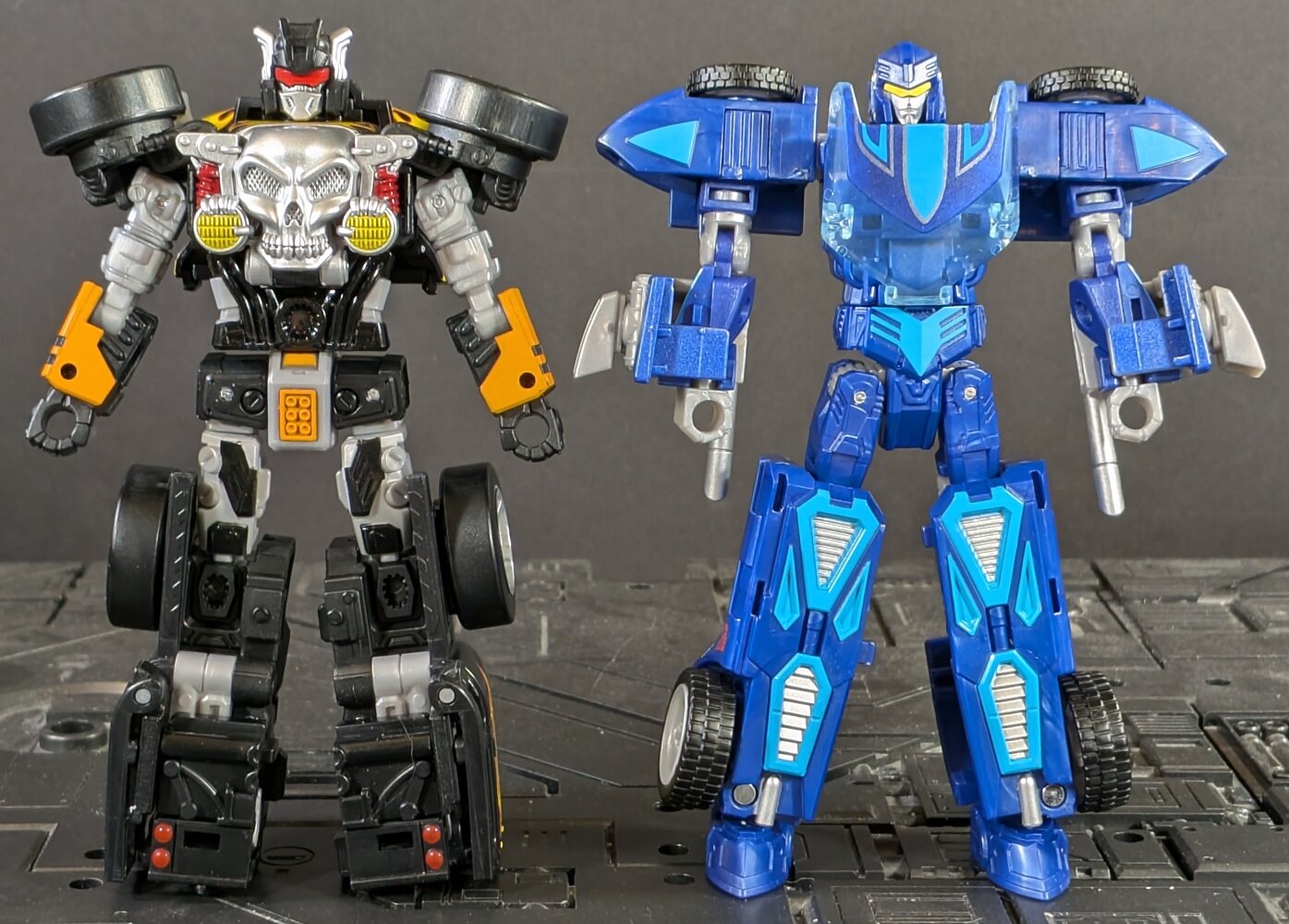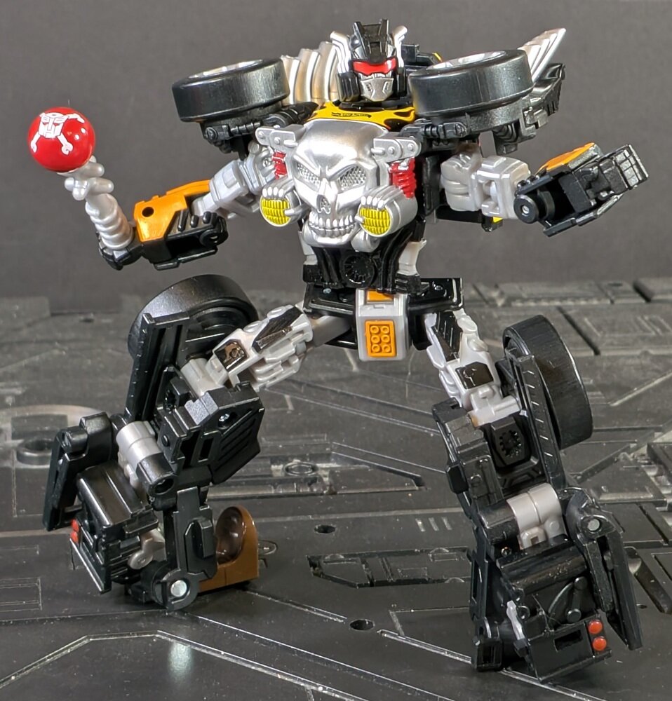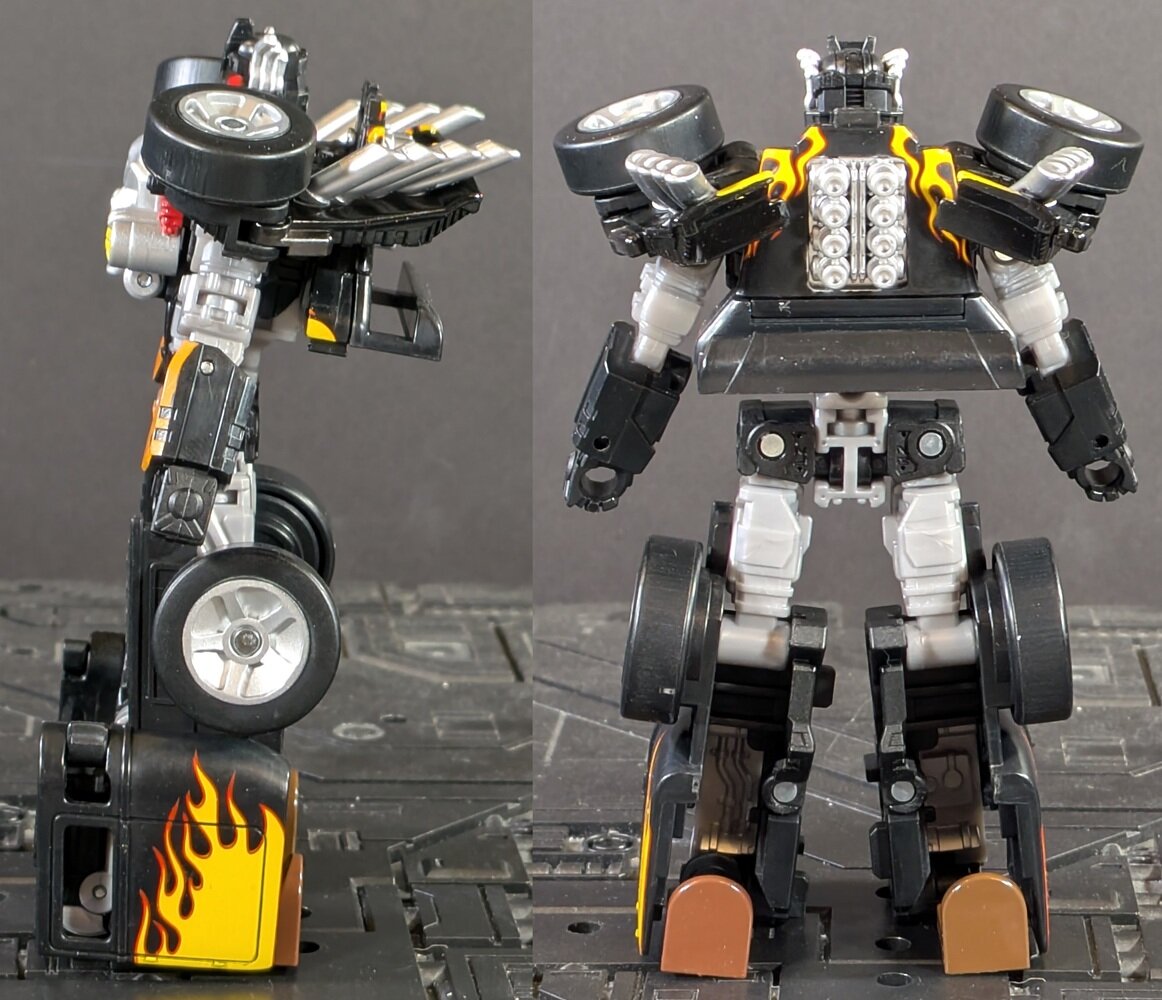 Despite not being nearly 60 years old like Twin Mill, Bone Shaker, first released in 2006, seems to be nearly as iconic. It also had a life-sized working version commissioned, and has appeared in several Forza games. And now it's a Transformer. Bone Shaker is kind of like the opposite of Twin Mill. Yesterday I praised Twin Mill for blending in with other Deluxe carbots due to his somewhat typical design and lack of overly Hot Wheels-esque elements. Bone Shaker's giant skull chest is instantly recognizable to Hot Wheels fans, though, and the bot it's attached to clearly has no interest in blending in. And yet, it totally works. Combined with his red eyes and face that managed to look angry even with a mask, Bone Shaker is a bot that oozes attitude. But not in a "I'm something else being shoehorned into Transformers way," like the pizza van from Stranger Things or a football helmet. More like in a Lobo or Deadpool way, like you stuck him in a comic book with the regular cast and he gave off so much main character energy you had to give him his own series. That attitude does come with a few drawbacks. He's not as clean as Twin Mill. The wheels aren't really his shoulder pads, they short of hover above his bare shoulders, with flaps of kibble tucked half-heartedly behind them. A windshield that doesn't fold at all sticks off his back. And his feet kind of aren't really feet. Like the front of his "foot" is actually part of his shin and doesn't move at all, while the flat bottom does move but is kind of just a flap. Bone Shaker's sole accessory is this... I guess mace. There's something like a skull and crossbones on it, but instead of a skull it's an Autobot badge. The packaging does suggest Bone Shaker's supposed to be an Autobot, but he gives me major Decepticon vibes. I'm kind of glad this is the only Autobot badge on the entire figure; rather than accept him as another Autobot, I'll imagine him as a Decepticon rival for Twin Mill. Bone Shaker's head is a ball joint, with a swivel and minimal down or sideways tilt, but he can look nearly 90 degrees straight up. The wheels over his shoulders are hinged so you can adjust them as needed to allow his shoulders to swivel and move just about 90 degrees laterally. His biceps swivel, his elbows bend 90 degrees, but he doesn't have wrist swivels. He does have a waist swivel, though, and his hips can go forward, backward, and laterally 90 degrees. His thighs swivel, and his knees bend nearly 180 degrees. The design of his feet don't really allow for up/down tilt, but the flat part that he actually stands on is hinged gives him about 90 degrees of ankle pivot. Bone Shaker can hold his mace in either hand. There doesn't seem to be any storage for it. Transforming Bone Shaker is relatively simple, and unlike Twin Mill doesn't require partsforming. Fold the skull on his chest open. That will open a gap that will allow you to rock the front of his torso up over his head. Don't close the skull yet, though! You need to open to fold the flaps with his shoulders attached down, tucking his shoulders together in the space his chest just vacated such that his elbows are bend 90 degrees with his hands tucked in just above his waist. Now you can close the skull, as well as fold the front wheels down and tuck the exhaust pipes into place. As for the rear of the vehicles, his legs tab together and fold over, Micromaster-style, but that's oversimplifying things a bit. You need to take his shins and hinge them out and away, giving you the clearance you need to fold his feet flaps around to make the seats. Once the legs are actually in place, the shins swing down to fill in the rear of the car. Bone Shaker has been released in a lot of decos over the years, and I'm not into Hot Wheels enough to say if what we've got here is accurate to any of them. Suffice to say that the flames-on-black works for him, though. And the shape of the car- exposed V8 on the nose, curling exhausts sticking out the sides, the big skull nose clutching the headlights, the open roof, and what I assume is a fuel tank in the back is all accurate to the 1:64 car regardless of the deco. I think Bone Shaker's Hot Wheels origin is more obvious than Twin Mill's and it's hardly a disguise, but he's still not totally out-of-place as a Transformer. G2 Laser Rods, anyone? There is the bit of Hot Wheels branding on the hood, but again, no faction symbols. The instructions fail to mention it, but there's a tiny tab at the bottom of the mace. This tab fits into a notch between the seats in his cabin, allowing in to store it in vehicle mode. Is it supposed to be a shifter? Bright red, smooth ball of the mace does sort of seem like it, but the scale of it vs the car is way off. I guess it's better than nothing, but why not just give him a gun that could tab into the slots on his rear? Bone Shaker is, in my opinion, another hit. Sure, he's got a bit more kibble, but he makes up for that with sheer charisma. He's got a solid transformation and a great alt mode; there's not a lot to complain about here. I'd love to see Hasbro and Mattel continue this collab, as it makes a lot of sense for both companies. And, fortunately, it sounds like I'm going to get my wish, as I know of at least three more in the works.- 17885 replies