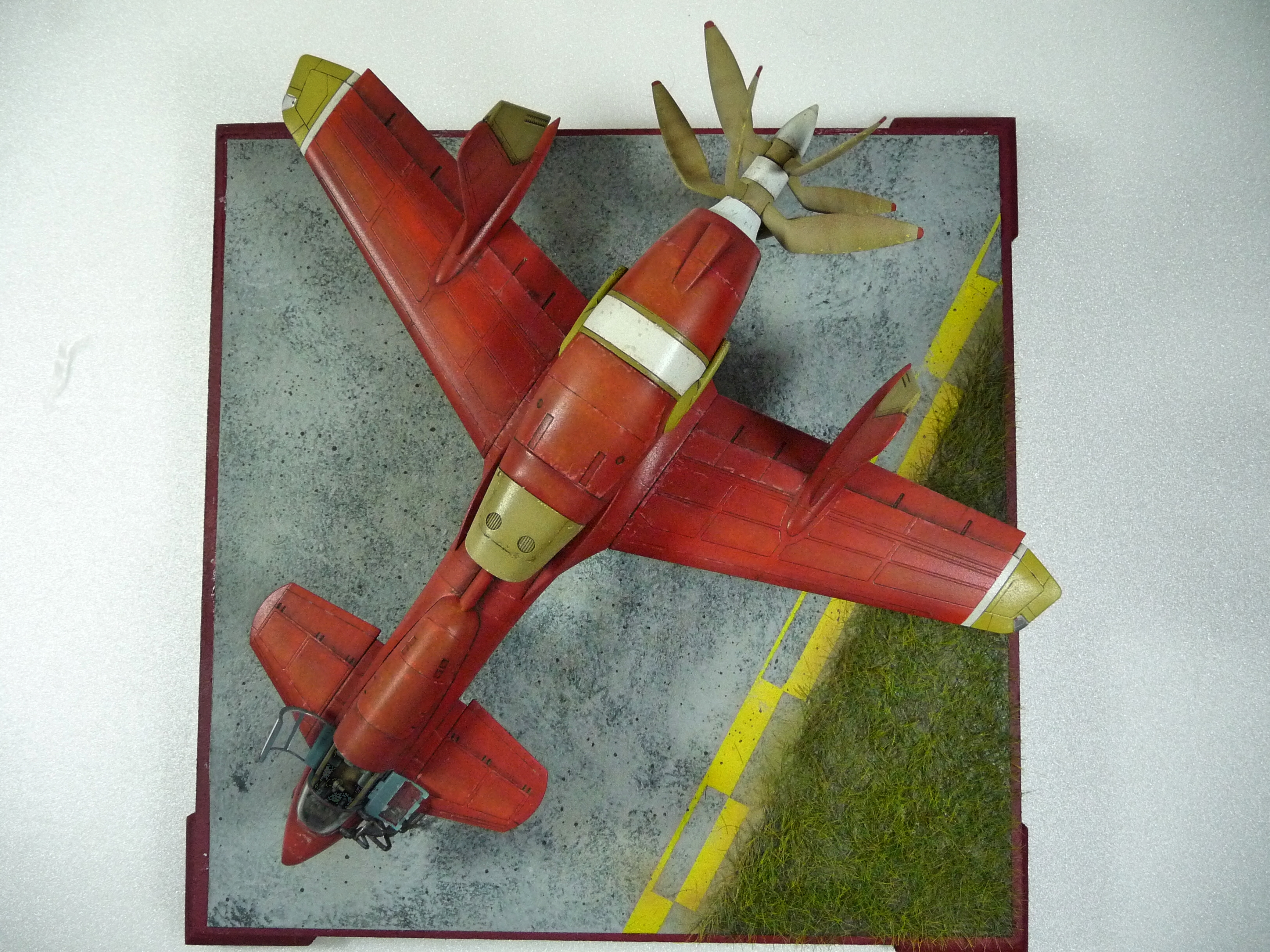 Thank you! Sorry for the late response. In fact I gave it quite a thoght. First gray primer wich will gave me a nice base to darken the red. Then pre-shading on panel lines with white to work as the faded color. Then a dark red all around. Chipping with a light pink. Seal it with gloss varnish, then panel lined with dark brown. Faded paint with yellow oil paint on top surfaces and some panels. Some other with light gray. Then streaks and etc. Thank you all for your replies! Martin