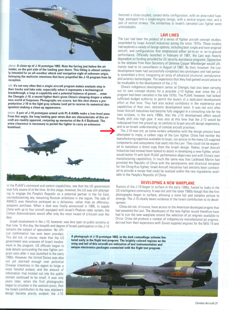 T.V. Posted February 2, 2007 Posted February 2, 2007 I found some pic for you guys. Thx! I still haven't found the lineart I was looking for, but then again the article is 1 or 2 years old and the mag is boxed up somewhere, so it'll take some time before I'll find it. Anyway, here's an page from a more recent article. It's from Combat Aircraft, nov '06. I marked the paragraph that deals with the discussion wether or not the J-10 is a "carbon copy" or simply a reverse engineered and modified Lavi, or an original design. I've added some Lavi line art as well.