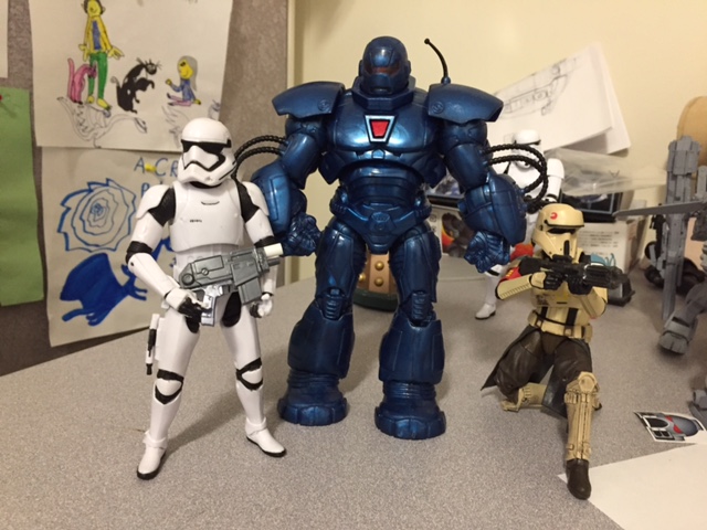Kelsain Posted October 12, 2017 Posted October 12, 2017 (edited) Alright, so I'll be starting work on the Sauron costume this weekend, I have 2 weeks until we trick or treat here in the 'Ville. In the mean time, I mentioned that I'd show my current WIP: It started with the Marvel Legends BAF Iron Monger. I found a good deal on eBay, and thought this guy had some potential. As it was, the figure I bought arrived broken, so the vendor replaced it with another for free! Here's the raw figure, standing beside 2 Black Series 6" troopers. My plan is to mod this figure into a 1/12 scale Space Marine! I removed the original hands & forearms & fashioned new with some 3/4" tubing. Turns out the hands of an MG Dom (that I've had laying about since 2002) are right in scale for this guy. I'm going to bulk up the fingers a bit, to make them look more like gloves than robot hands. Legs have been lengthened with some 3/8" spacers & custom stompy boots were printed from Shapeways. This adds about 1/2" height to the figure, bringing him to ~ 8.5 feet in-scale. I might add a little torso length to bring him closer to 9 feet. Unfortunately, I mis-scaled the helmet that I designed. It's about 15% too big. Will have to readjust that and try again. I also have a backpack designed in 3D, but I'm gonna wait till I have a few other parts ready & find a coupon before I order. The nozzles are designed to rotate. In the mean time, I'm working on putting together his first armament, a bolt pistol. I'd originally planned on using an MG Ground Gundam gun, but I found a Kotobukiya M.S.G. rifle that seemed to work better. Just chopped off most of the barrel & swapped out the grip. "Pistol" seen here in the arms of the FO Trooper: And apparently, I can't get rid of this extra pic: Edited October 12, 2017 by Kelsain Quote